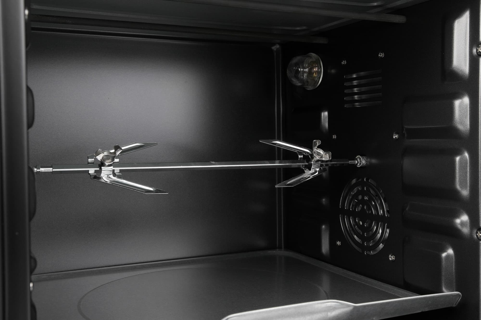 По центру на боковых сторонах камеры имеются пазы для установки вертела. Вентилятор и лампа для освещения расположены на правой боковой стороне.