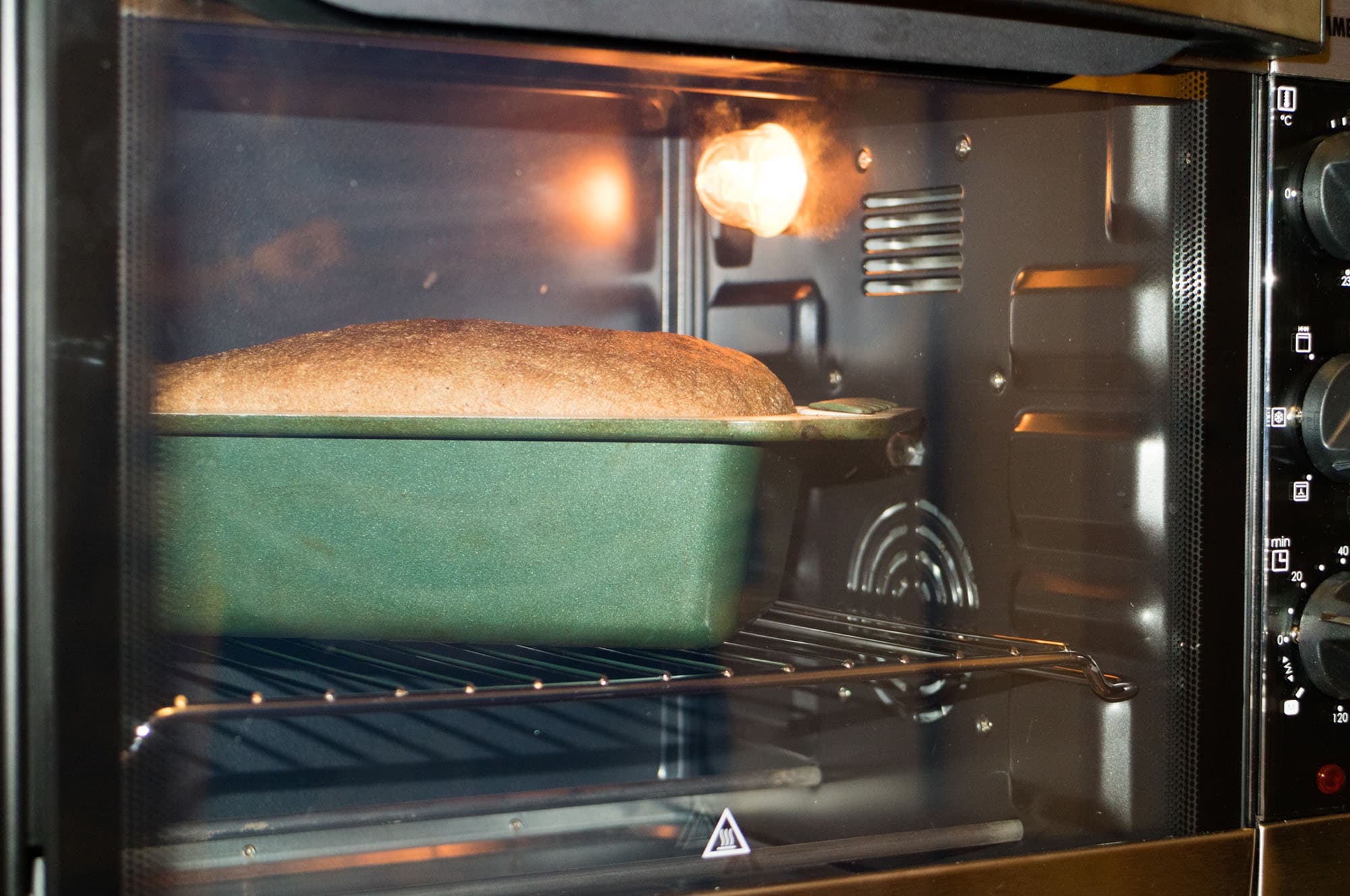Перед этим тестом мы долго примерялись к внутренней камере. У нас были опасения, что имеющаяся прямоугольная хлебная форма велика для данной печи и верх хлеба находится слишком близко к верхнему нагревательному элементу. Однако наши опасения не оправдались. Тесто не подгорело, несмотря на то, что расстояние между верхом хлеба и нагревательным элементом составило около 7 см, а между низом хлеба и нагревательным элементом — около 6 см.