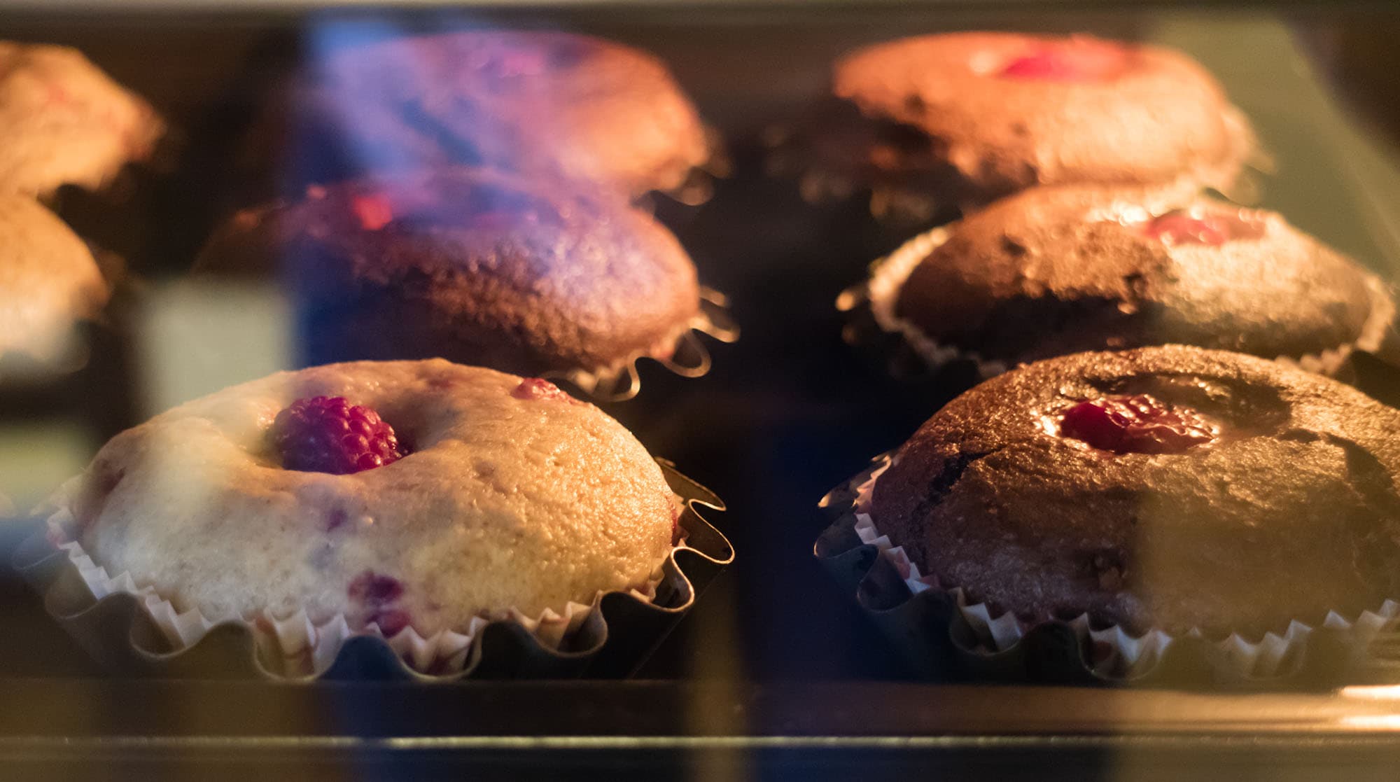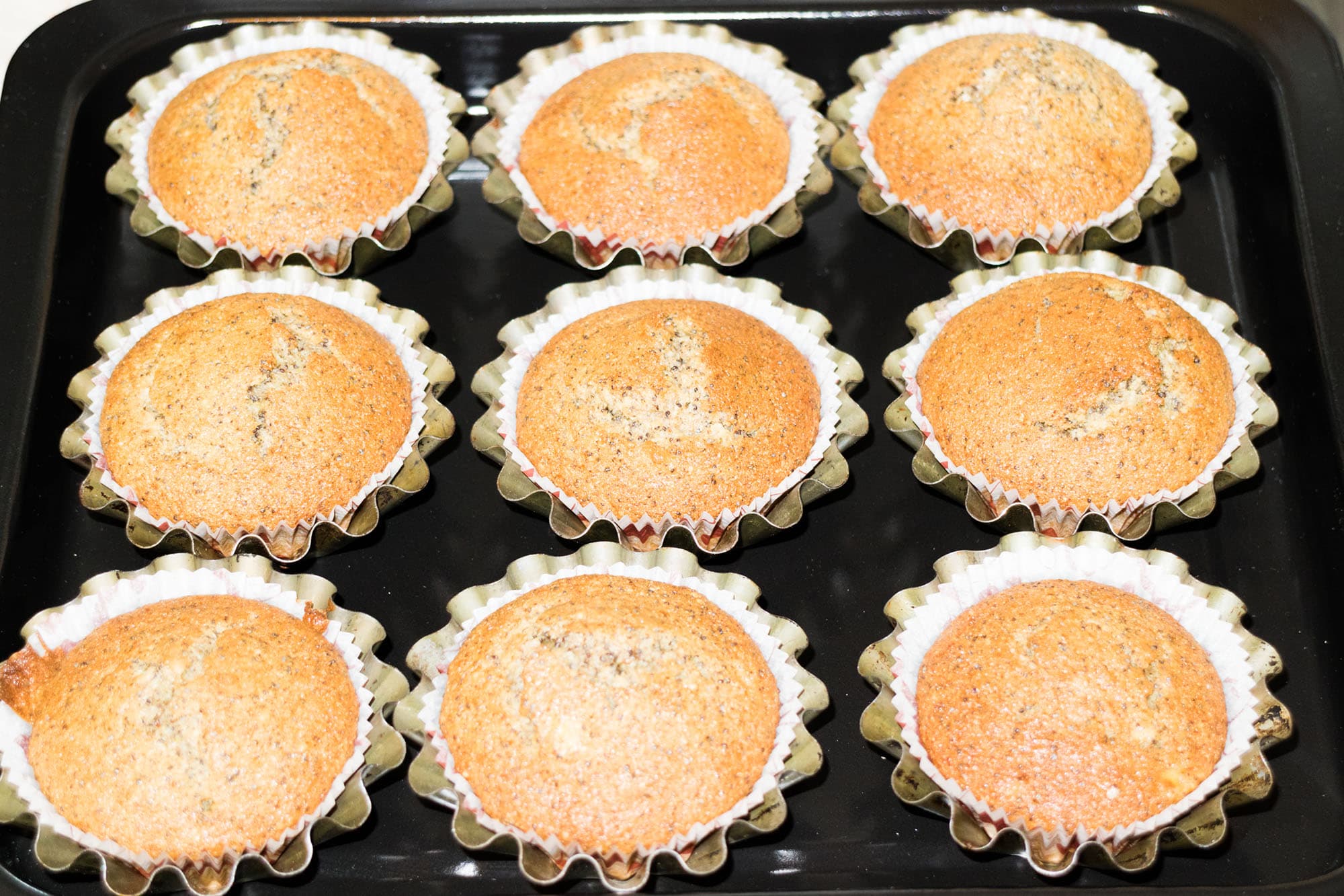 Выпекали 20 минут при 180 °C в режиме «Верхний/нижний жар с конвекцией». Первой порцией пекли кексы с маком, чтобы проверить равномерность работы печи. Результатом остались довольны. Как видно на фотографии, поверхность кексов практически одинакова по цвету, лишь слегка бледнее у крайних изделий.