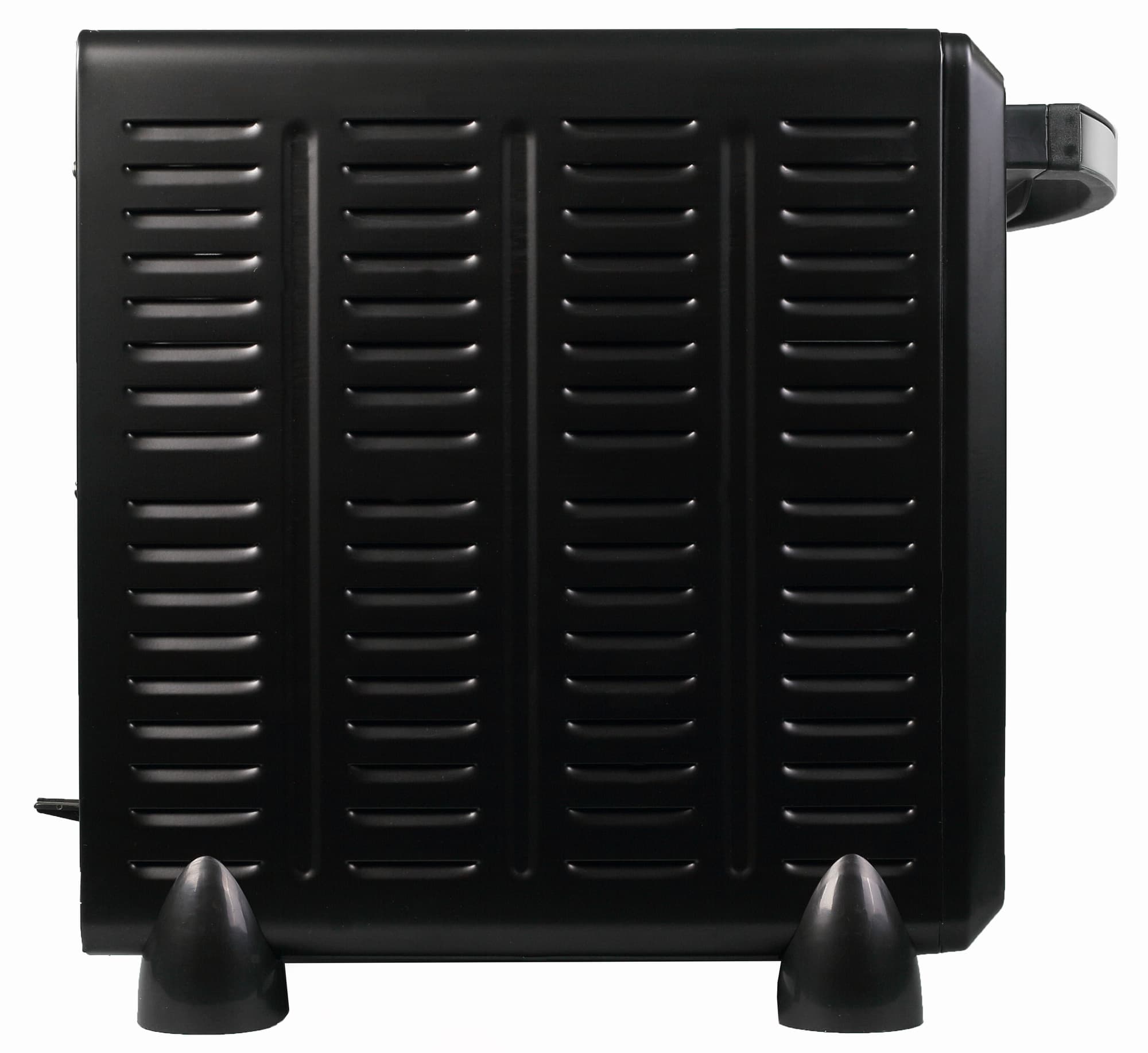 Задняя поверхность изготовлена из неокрашенного металла. Широкие вентиляционные отверстия имеются со стороны панели управления. Вдоль верхней и левой сторон устройства расположены узкие щели простой прямоугольной формы. Также здесь имеются два ограничителя, не позволяющие установить печь вплотную к стене или другой боковой поверхности.