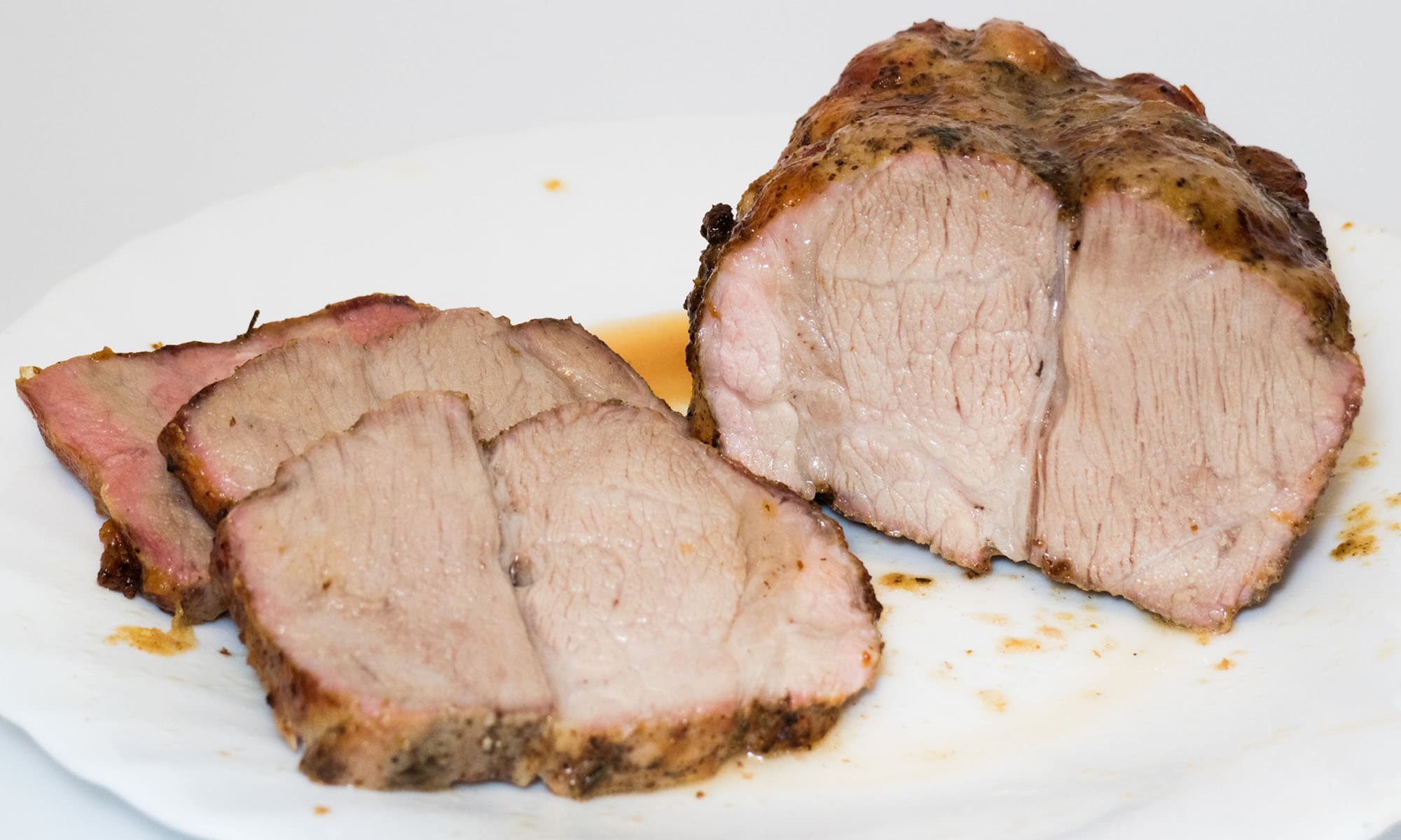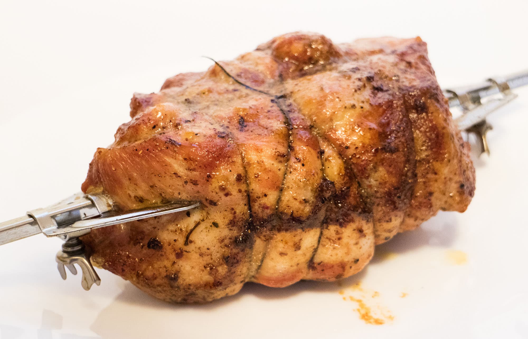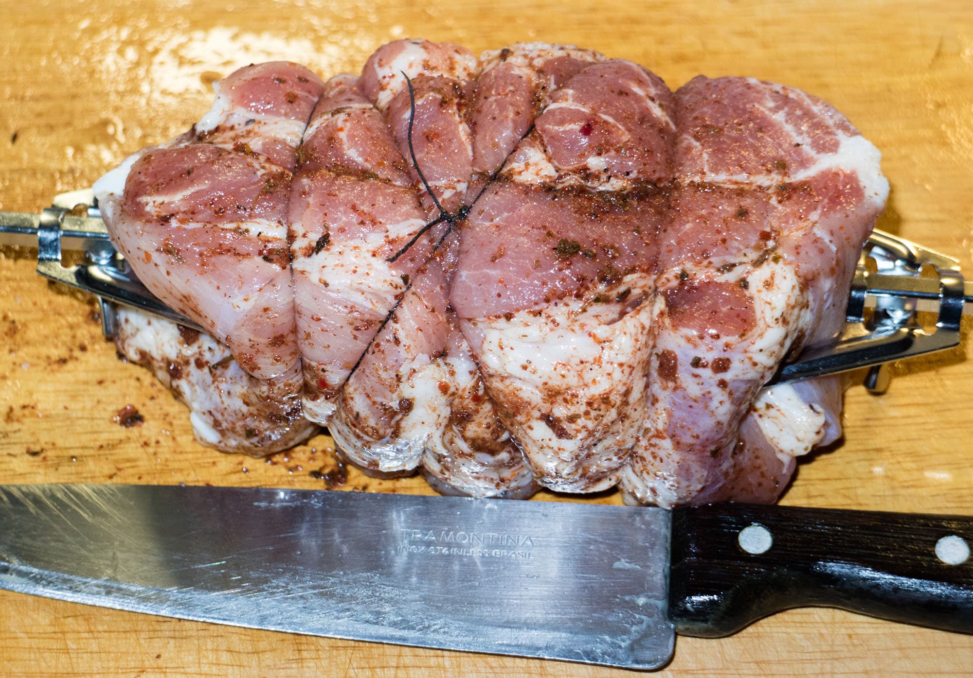 Признаемся, что этот тест родился спонтанно. Изначально на вертеле мы хотели запечь курицу, но тушка оказалась велика. Можем отметить, что, на наш взгляд, на вертеле лучше размещать продукты весом около килограмма, максимум 1,3 килограмма. (К сожалению, в инструкции не было указано, продукты какого веса рекомендовано запекать.) Поэтому мы даже не пытались водрузить на вертел тушку весом 1,7 кг — визуальный осмотр и прикидки вызвали большие вопросы к успешности эксперимента. Зато у нас в рассоле лежала прекрасная свиная шея, предназначенная для приготовления то ли ветчины, то ли буженины. Отрезали от большой шеи кусочек весом в 680 г и закрепили его на вертеле, замотав для надежности и сохранения формы ниткой.