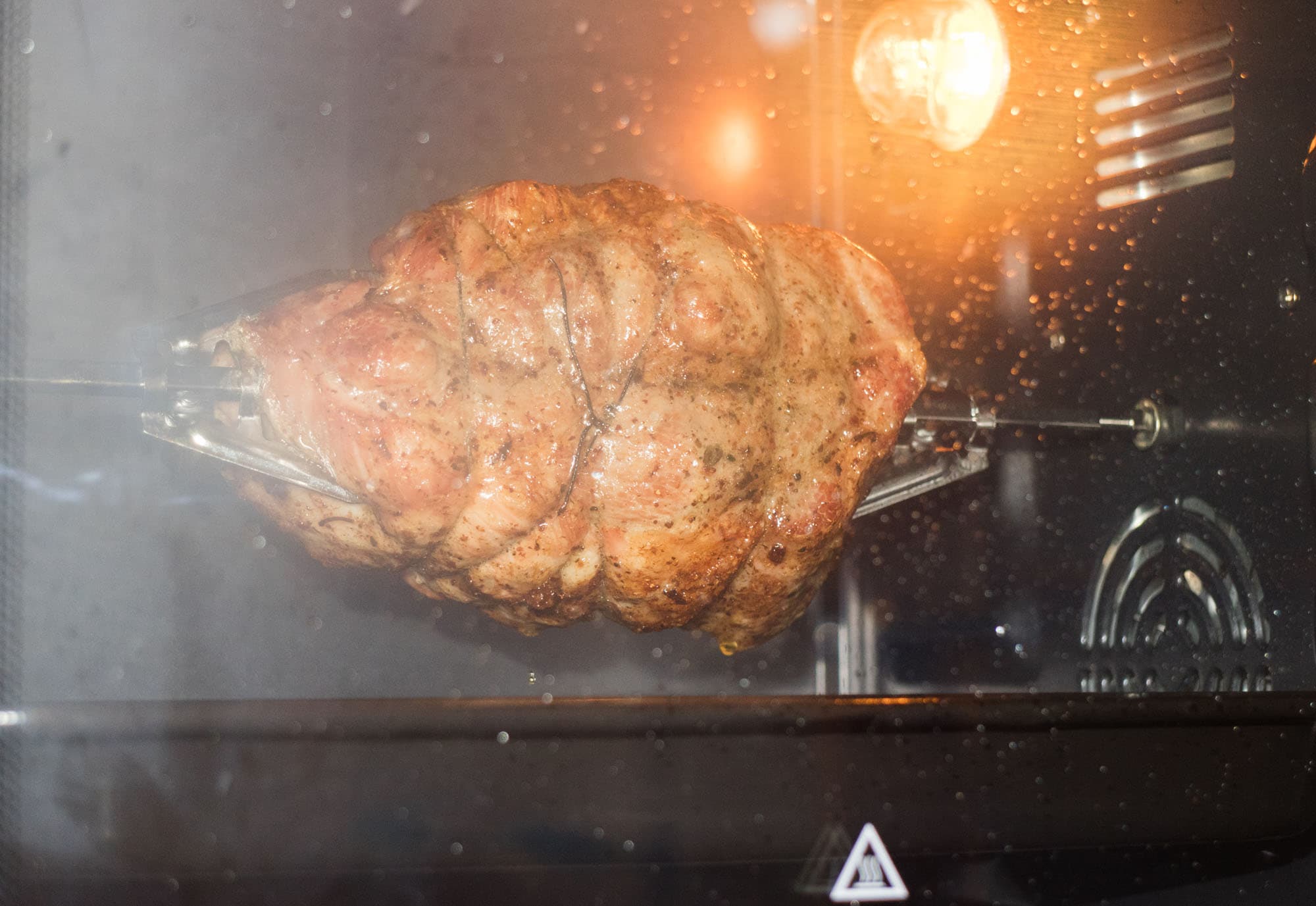 В нижней части камеры разместили противень, наполовину заполненный водой, как это рекомендовано инструкцией. Вода нужна для того, чтобы поднимающийся водяной пар сделал жарящиеся продукты особенно нежными. Запекали ровно один час в режиме «Верхний/нижний жар с вертелом» на максимальной температуре в 230 °C.