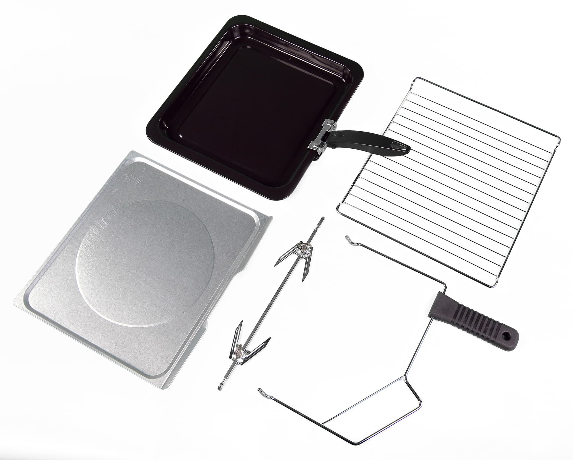 Входящие в комплект аксессуары — противень, решетка, вертел — имеют обычную для такого типа деталей конструкцию. Выглядят прилично, без особенностей и недостатков. Наличие ручек для противня и гриля вызывают определенное уважение к производителю, который обеспечивает удобство эксплуатации даже при выполнении такой тривиальной операции, как извлечение блюда из горячей духовки.
