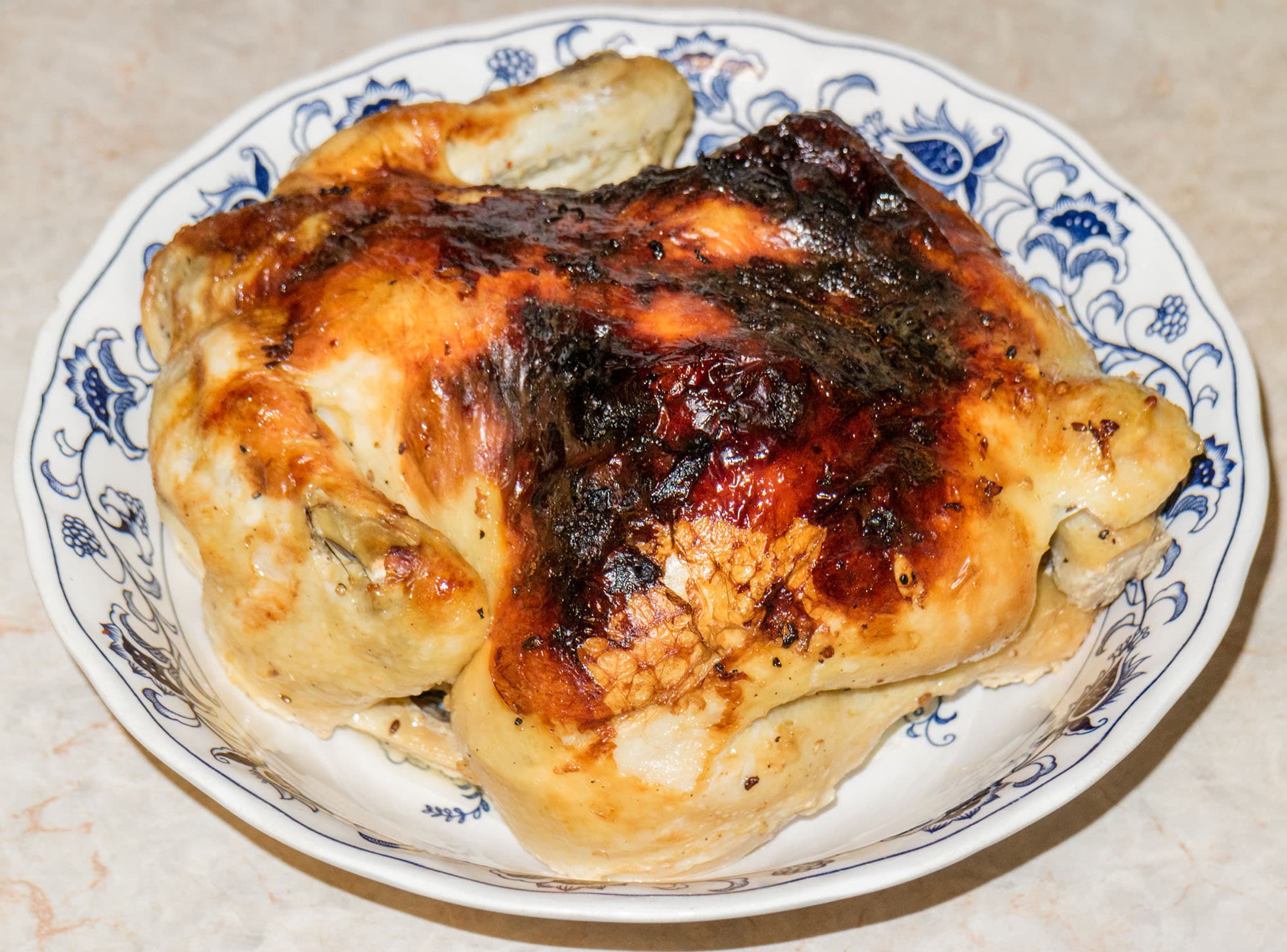 Тушка курицы была обмазана смесью специй, чеснока и сметаны. Пролежала в маринаде около суток. После этого ее поместили в рукав для запекания и установили в духовку на 180 °C. Запекали в режиме «Верхний/нижний жар с конвекцией» один час. Затем мы разрезали рукав сверху и перевели духовку в режим «Верхний жар с конвекцией» на 230 °C. Поджаривание продолжалось примерно 10 минут.