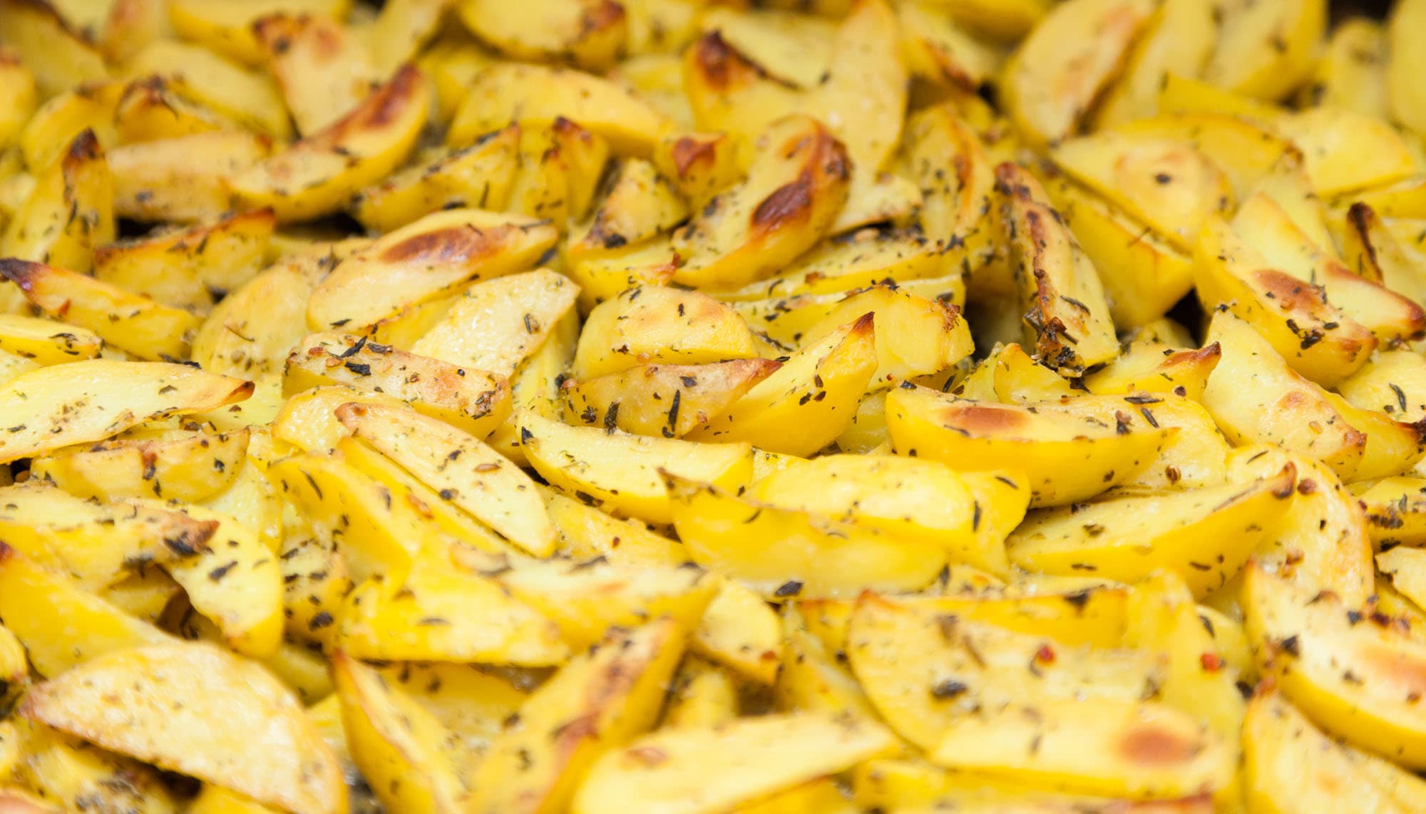 Картофель очистили и нарезали. Затем в чашу с подготовленным картофелем добавили соль, перец, сухую зелень, сухой порошок чеснока, добавили сливки и тщательно перемешали. Выложили на противень, разровняли и поставили запекать. В режиме «Верхний/нижний жар с конвекцией» на 200 °C блюдо готовилось 45 минут. Один раз открывали духовку и перемешивали содержимое противня.