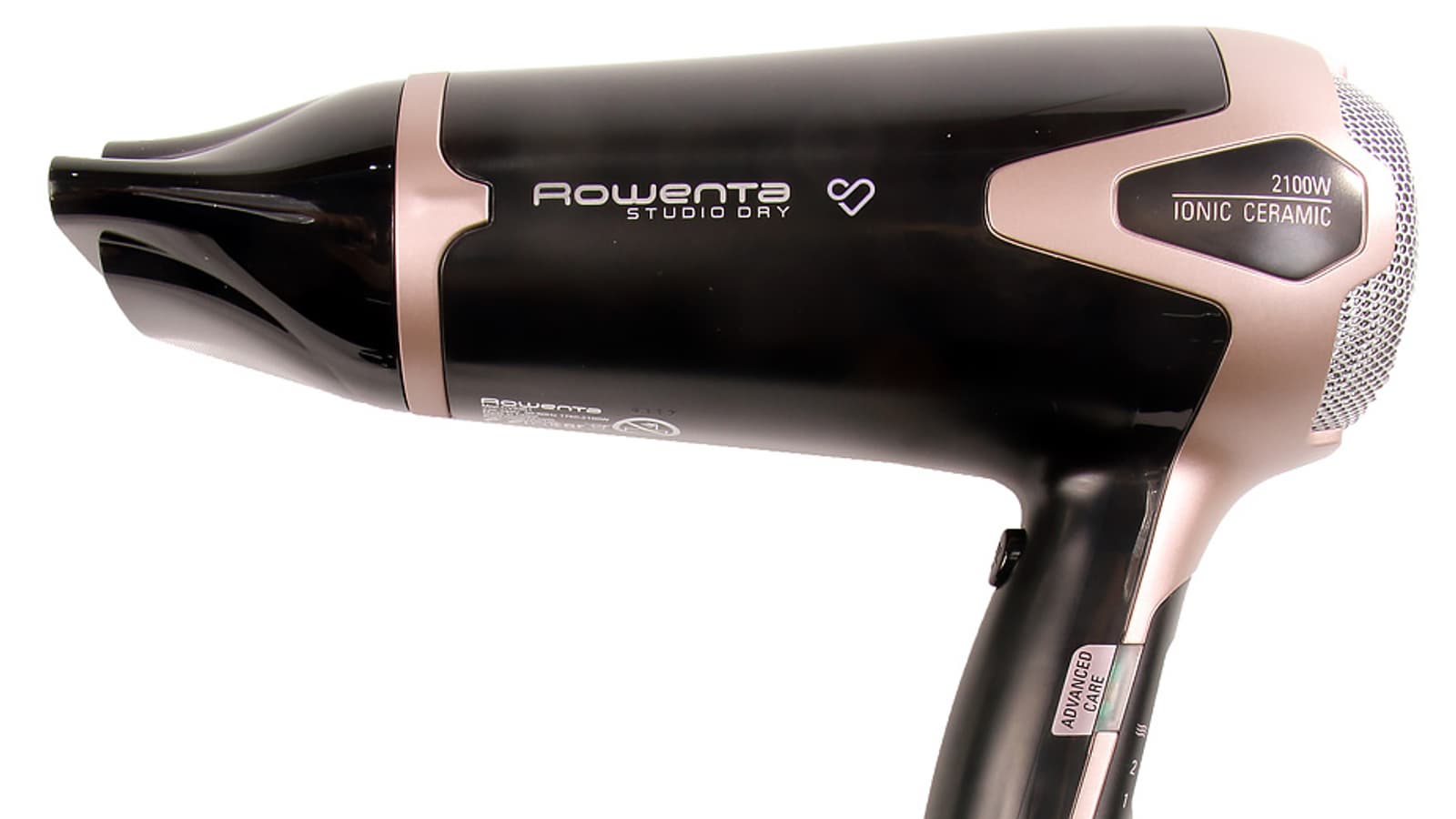 Фен Rowenta имеет благородную родословную и обучен регулировке силы воздушного потока, выбору температуры и имеет в вассалах оригинальную насадку-концентратор. Уже понятно, откуда в названии Premium Care (будь вы хоть феном, хоть кормом для кошек — говорите о заботе) и Studio Dry 2100 W (мощность фена сравнима с профессиональными моделями). Ionic обозначает функцию ионизации по умолчанию, а Ceramic — особое керамическое покрытие рабочей поверхности.