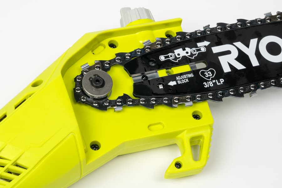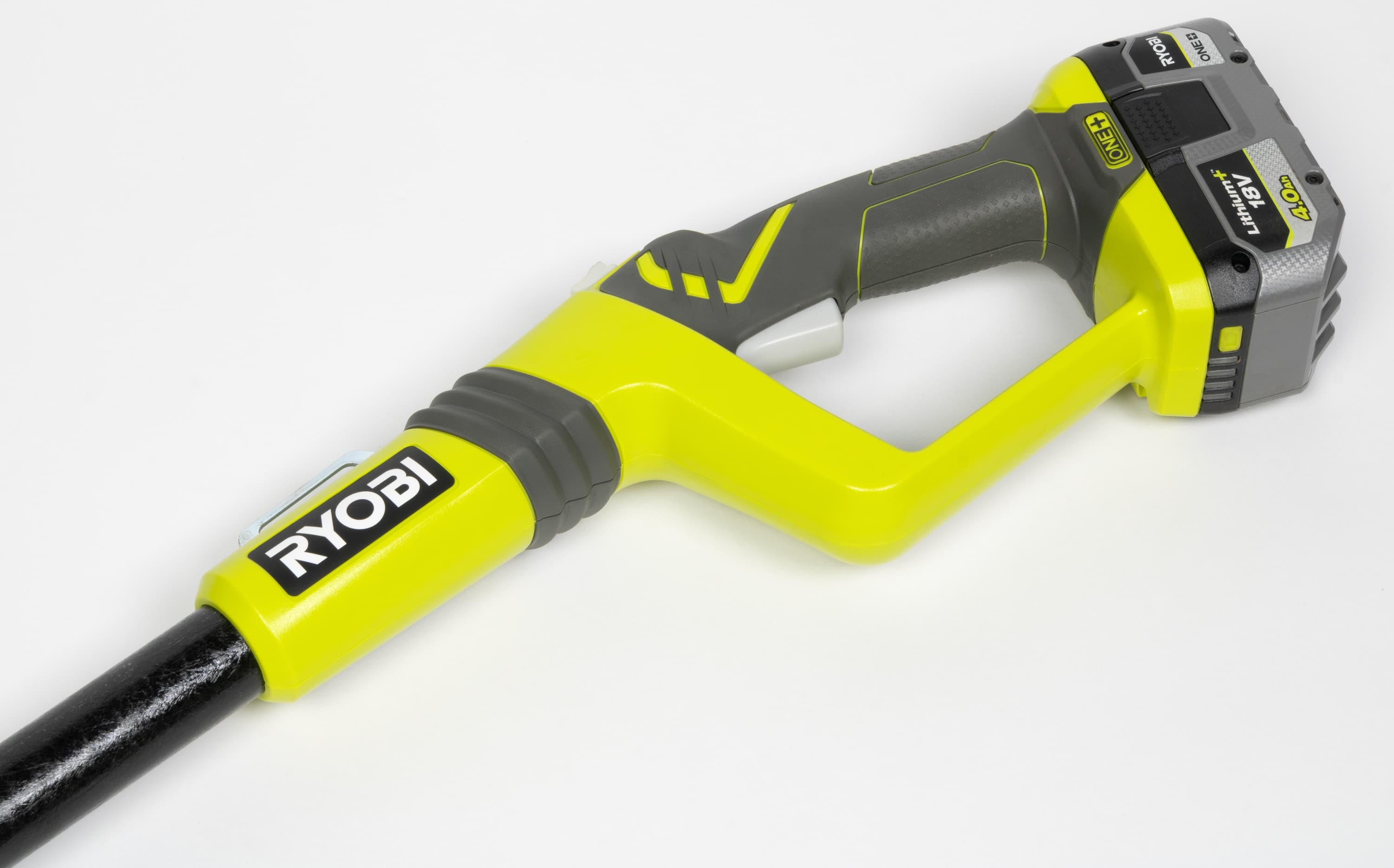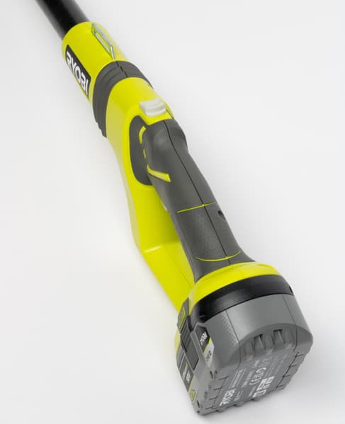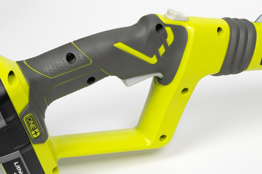 Ярко-лимонный цвет корпуса пилы во время работы помогает определить положение инструмента среди густой листвы. В инструменте используется щеточный двигатель, поскольку нет никакой необходимости в экономии батареи.