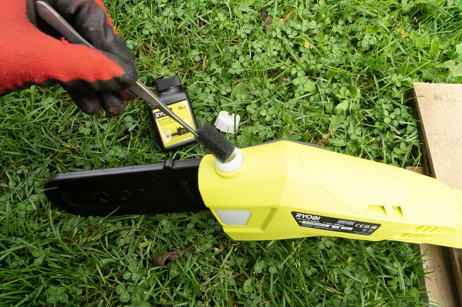 Перед заливкой масла в бачок следует закрепить пилу так, чтобы она не опрокинулась набок. Ну, или попросить кого-то подержать инструмент. И да, скорее всего, понадобится острый длинный предмет — пинцет предпочтителен — чтобы вытащить из бачка кусочек поролона, который имелся в новой пиле. Для чего он тут? Транспортировочная защита? Но не фильтр, это точно. Мы его просто выбросили.