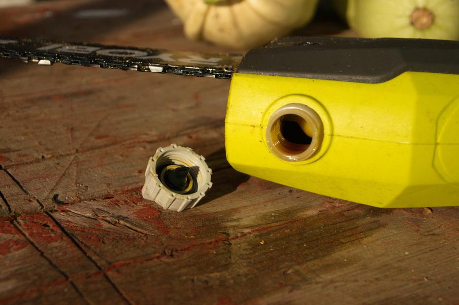 После недолгой, но крайне плодотворной работы пилой перво-наперво хотелось бы поговорить о масле. О цепном масле. Бачок пилы, в который заливается цепное масло, имеет объем около 80 мл. Признаться, это немного, учитывая повышенный аппетит нашего инструмента. Как оказалось, цепное масло пила потребляет изрядно: за 10-15 минут непрерывного пиления бачок опустел почти досуха.