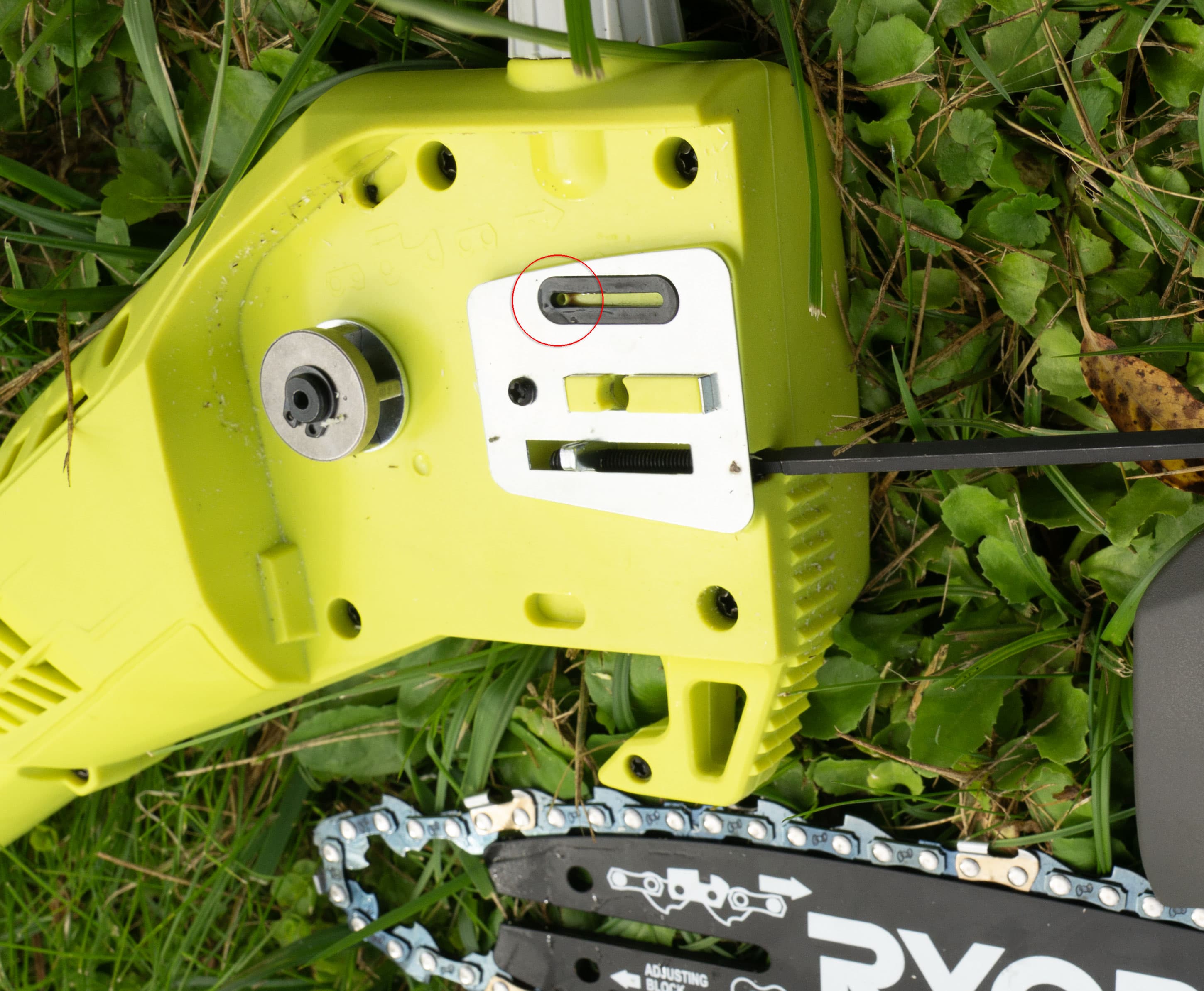 Перед регулировкой натяжения цепи следует чуть ослабить болт, прижимающий крышку. Для натяжения используется тот же комплектный ключ, только другой его конец, длинный. Он вставляется в неприметное отверстие рядом с цепью, поворот ключа натягивает либо ослабляет цепь. Сильно натягивать не нужно: цепь должна немножко «гулять», без труда отходя от шины примерно на 3 миллиметра (для полноразмерных пил допускается больший зазор, но наша пила коротенькая).