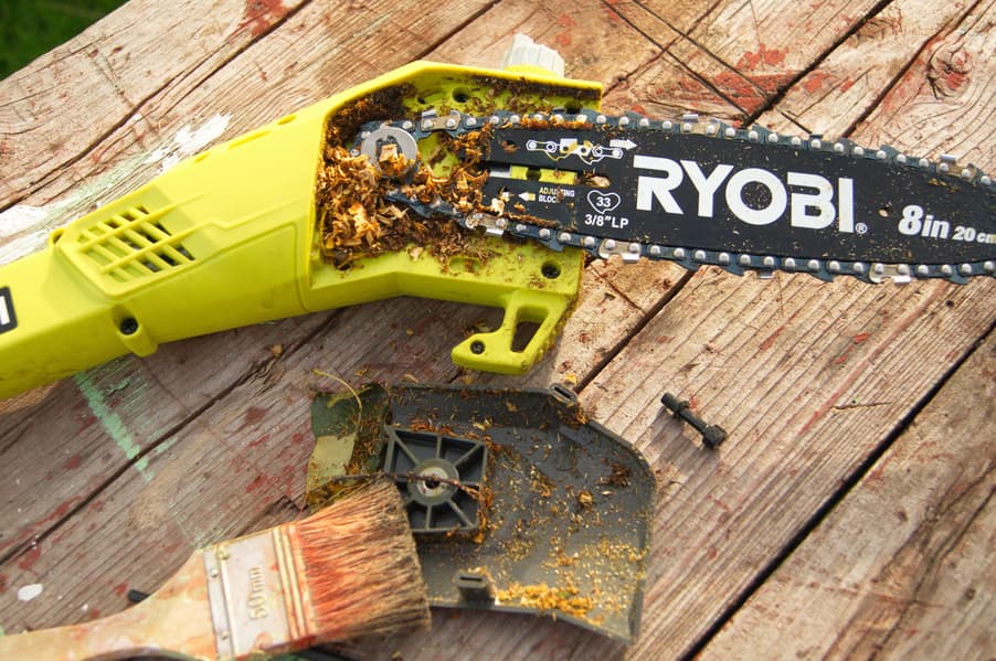 Пильная цепь при контакте с древесиной забрасывает внутрь корпуса пилы весь мусор и опилки. Еще и утрамбовывая всё это в плотную кашу, щедро сдобренную цепным маслом. После каждого сеанса работы все эти загрязнения необходимо удалить, отвинтив крышку и сняв шину с цепью. Для чистки удобно использовать жесткую кисть, а протирку можно произвести тряпкой или ветошью.
