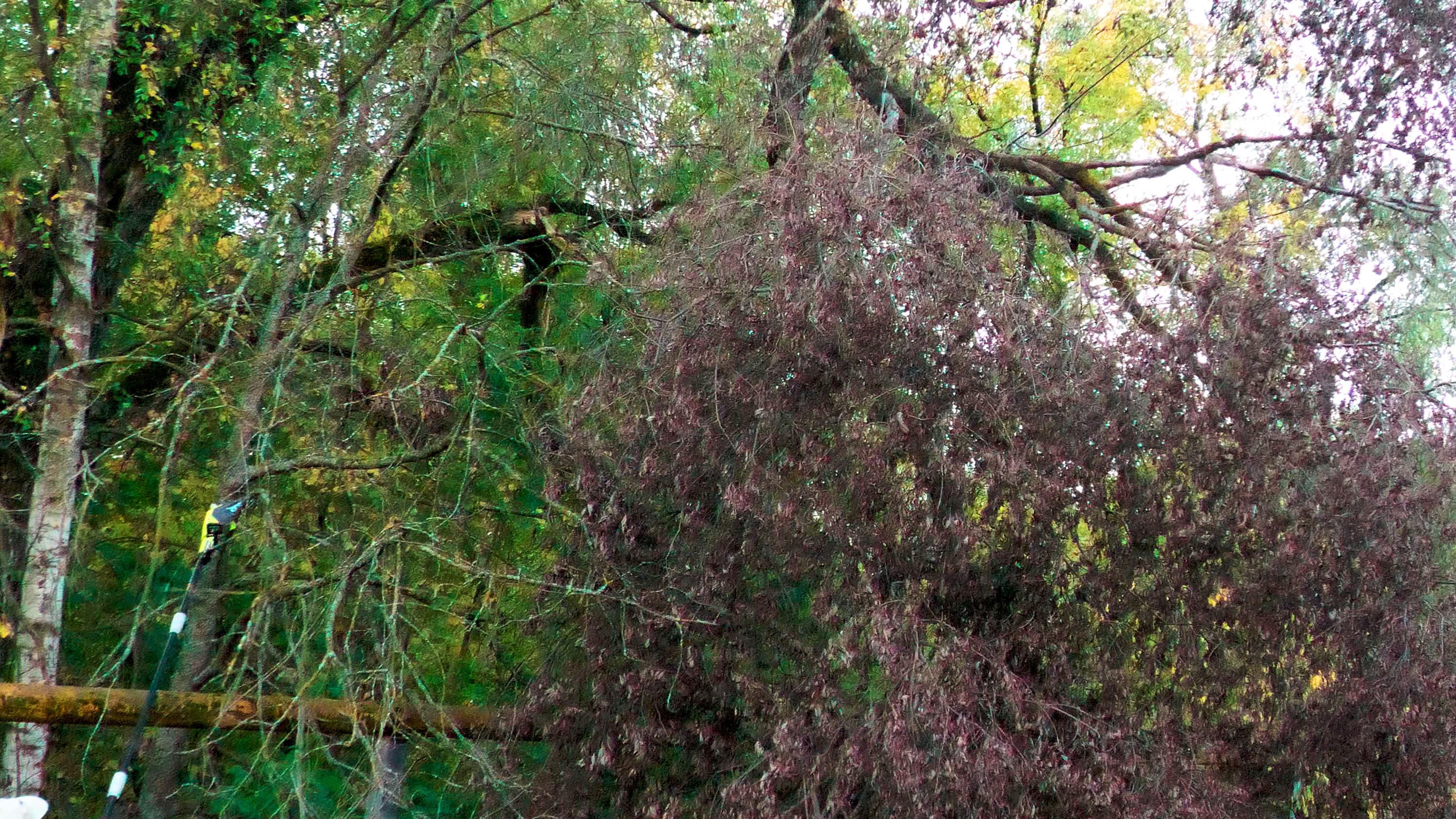 Мы уже говорили об одном из главных преимуществ штанговой пилы: возможности подобраться к веткам и сучьям, которые недостижимы из-за особенностей ландшафта. Именно такую ситуацию удалось «разрулить» с помощью тестируемой пилы. Дело в том, что над дальним заболоченным концом большого участка склонилась половина старой высокой ивы, отломившаяся во время летней грозы. Отпилить всю половину невозможно, для этого нужна тяжелая техника, позволяющая работать на высоте. Но чтобы ее подогнать, требуется дорога, а здесь только заболоченные густые заросли вперемешку с пнями. Обычной пилой к веткам также не добраться, стремянку не поставишь из-за вязкого грунта — речка рядом. Остается либо ждать несколько месяцев или лет, пока ветки окончательно не высохнут и не отпадут самостоятельно, либо воспользоваться нашим высоторезом. Был выбран второй вариант: потребовалось немногим более 10 минут, чтобы избавиться хотя бы от этих нависающих ветвей. Спасибо, Ryobi.
