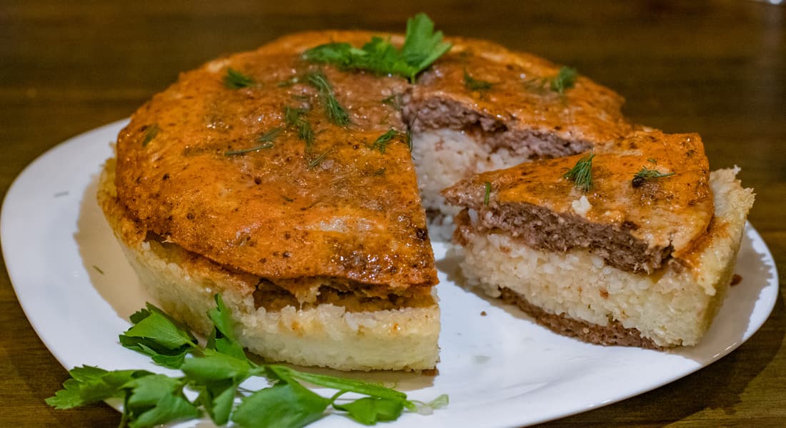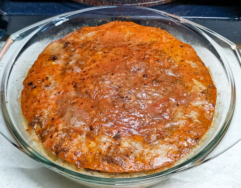 На рис ровным слоем уложили оставшийся фарш и залили сверху яйцом, смешанным с кетчупом, острым перцем и специями. Поставили в микроволновку при мощности 600 Вт на 25 минут.