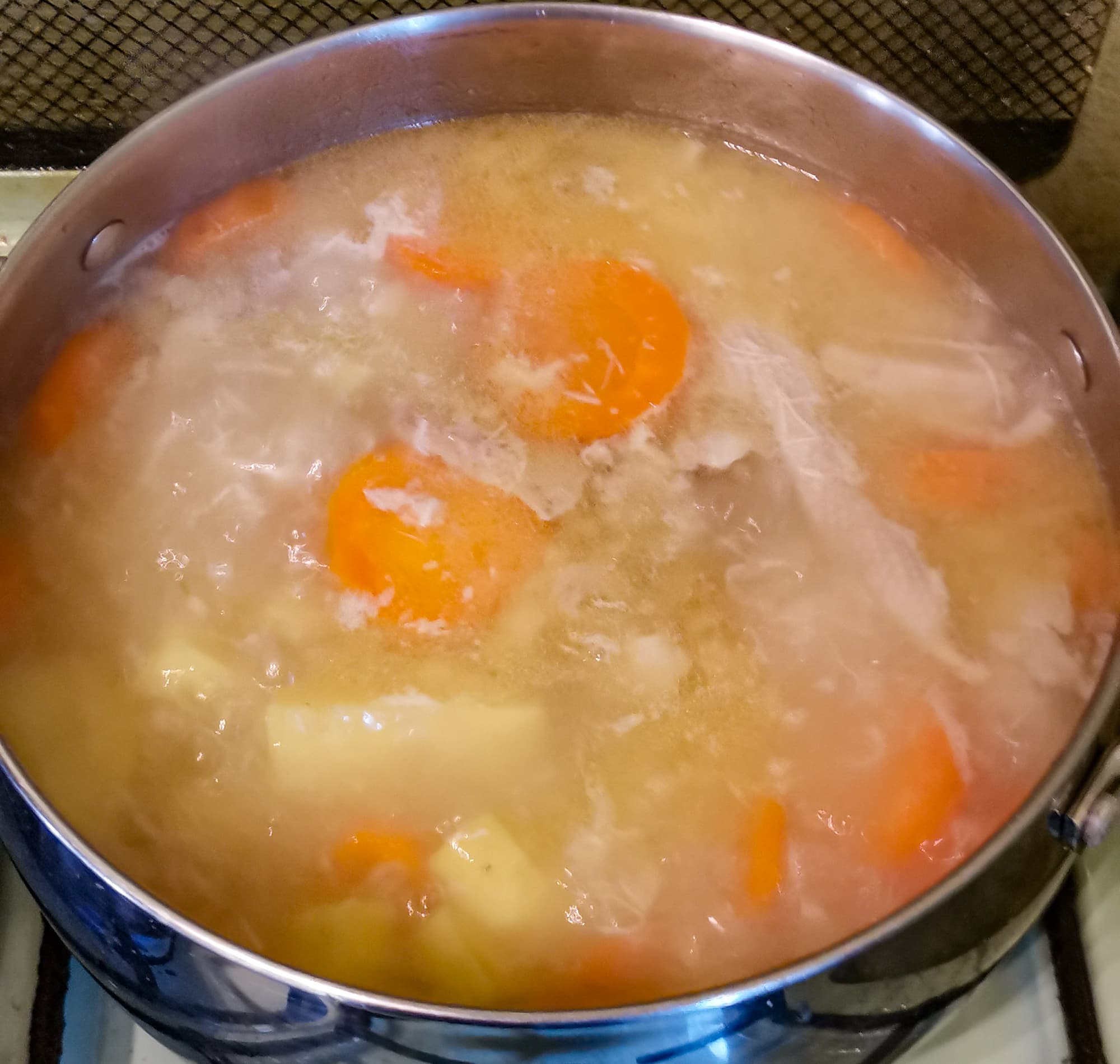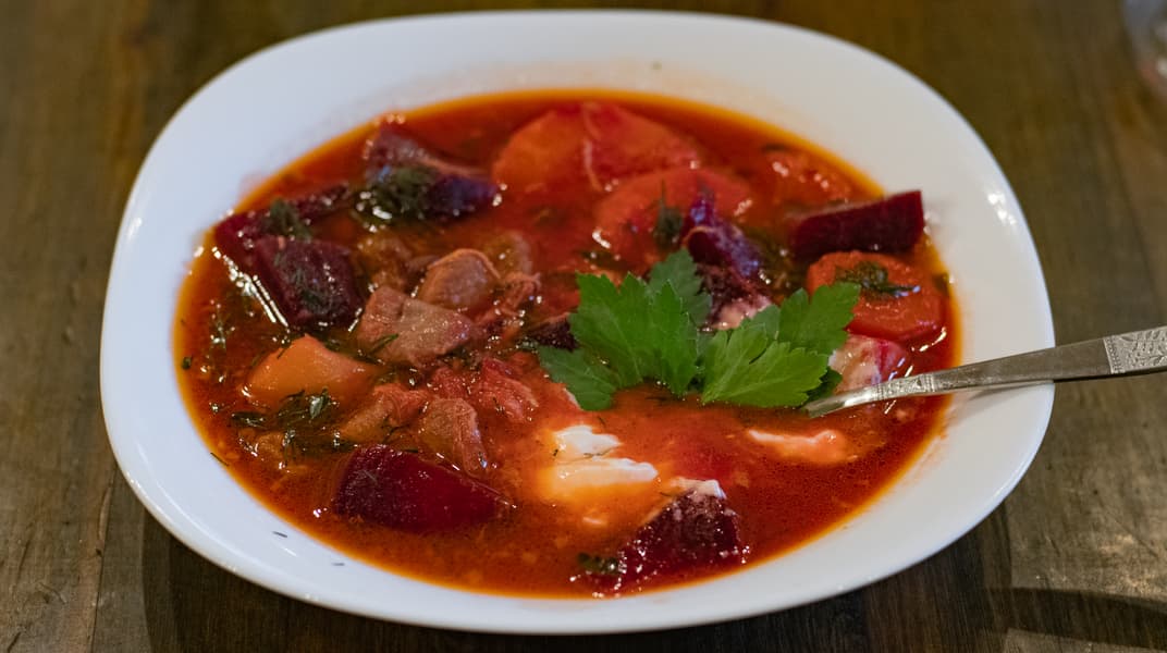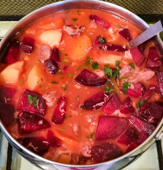 В сваренный предварительно бульон с картошкой и морковью положили мясо, а затем нарезанную свеклу, спассерованную с помидорами.