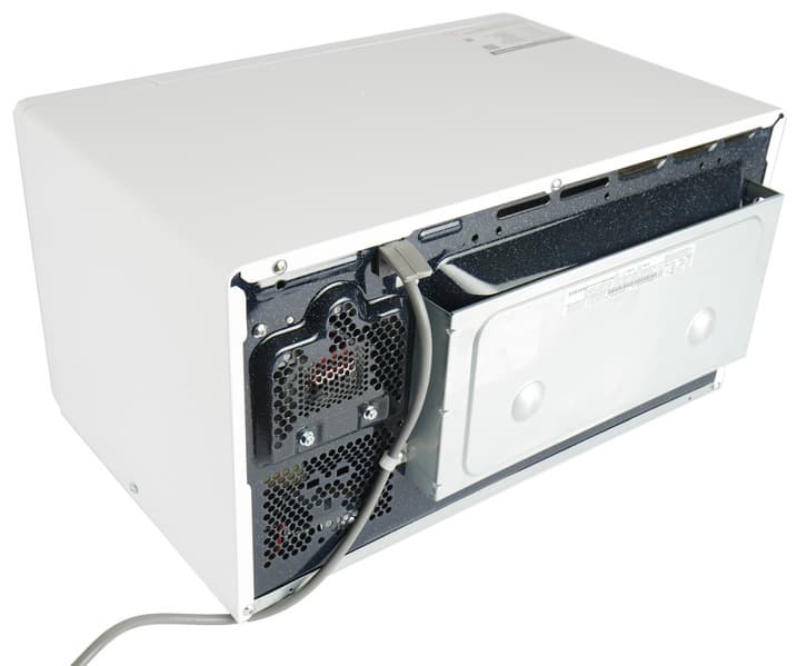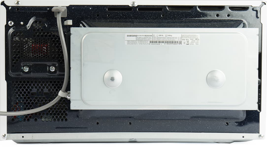 Гриль расположен достаточно низко, что уменьшает в высоту внутренний объем камеры, но стандартный защитный колпак для микроволновок в Samsung MG23K3614AW входит спокойно.