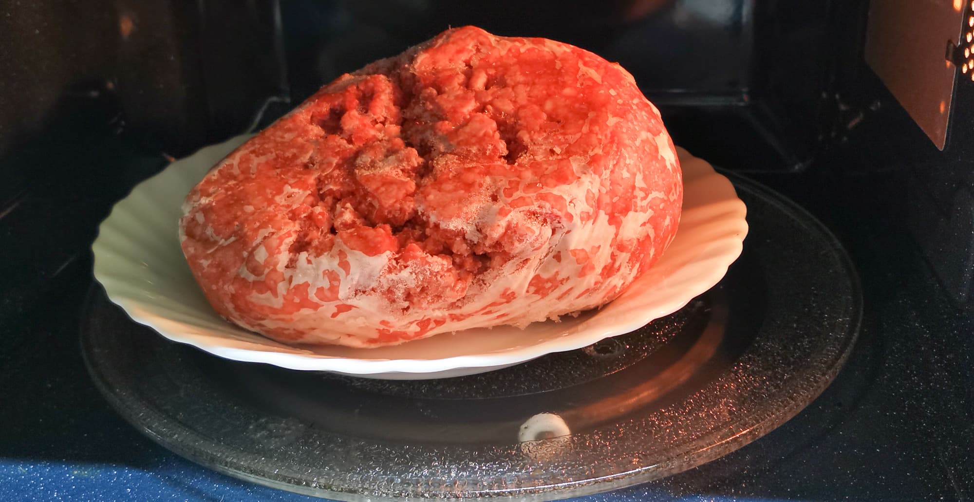 Примерно через 10 минут прозвучал звуковой сигнал, вероятно для напоминания, что продукт надо перевернуть. Мы перевернули наш кусок фарша, он казался все еще совсем замороженным, и отправили обратно.