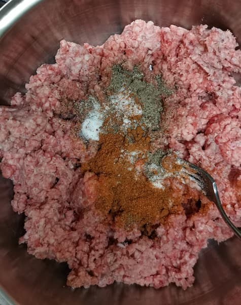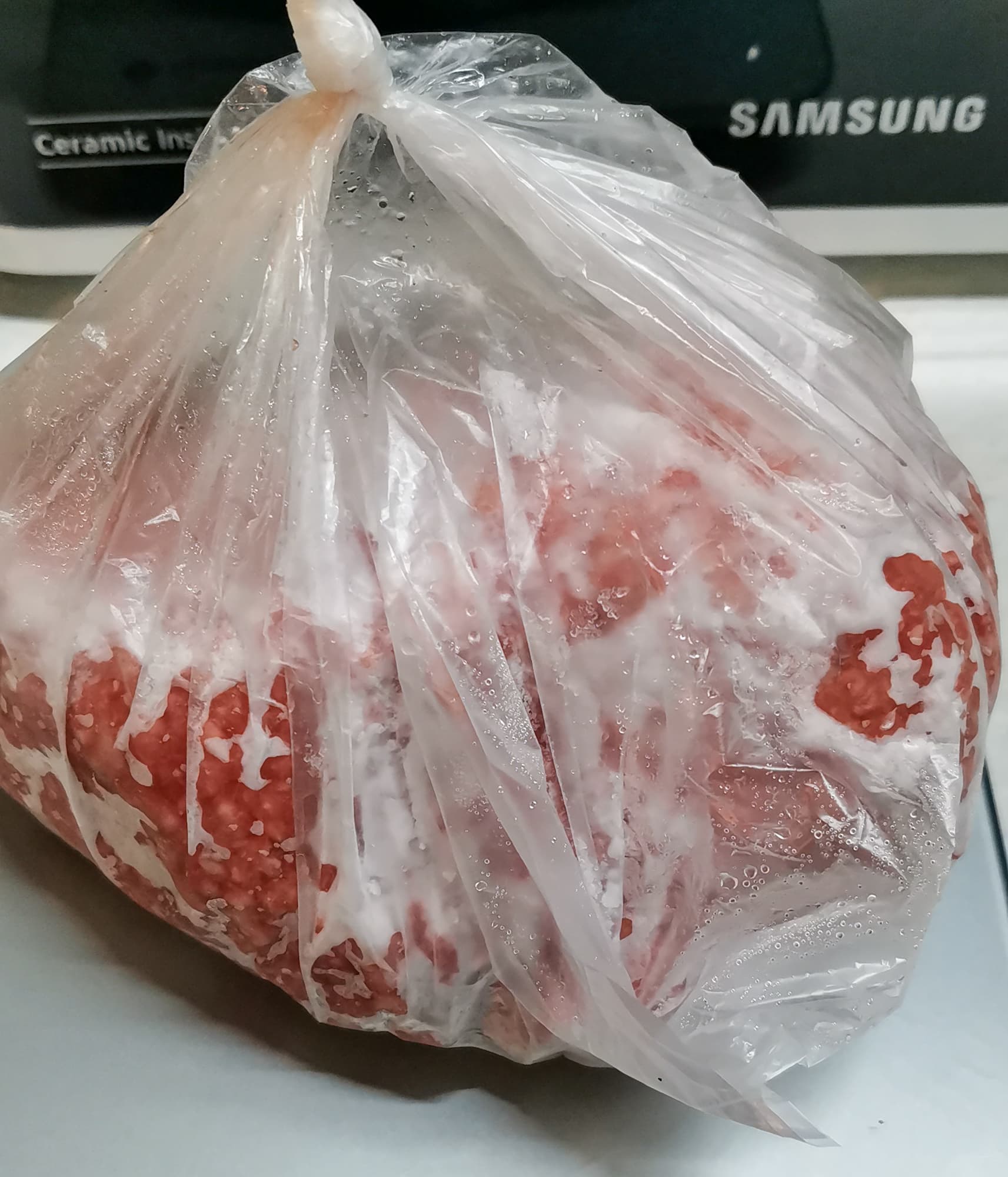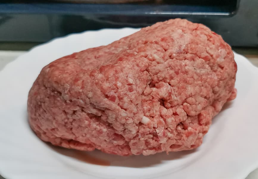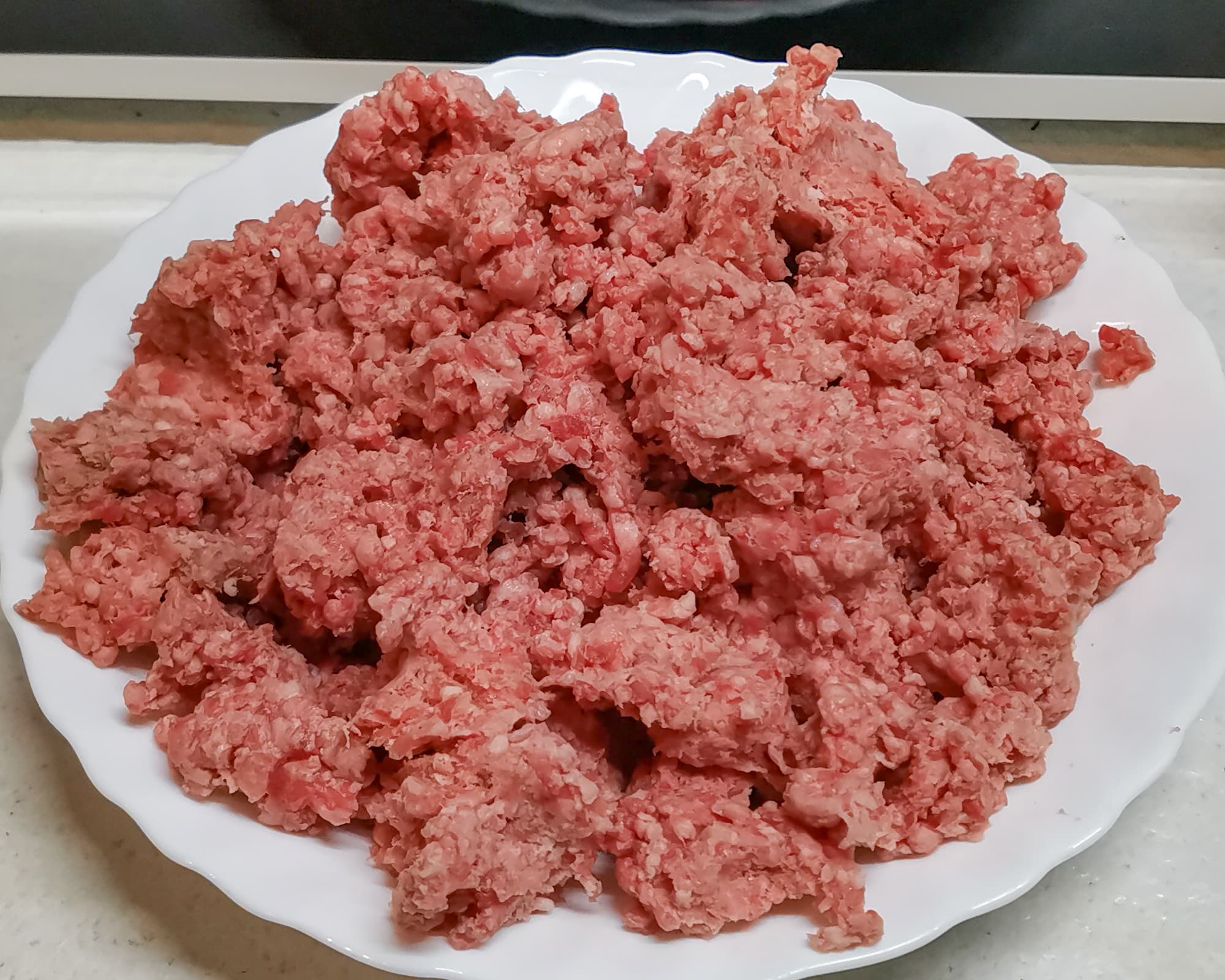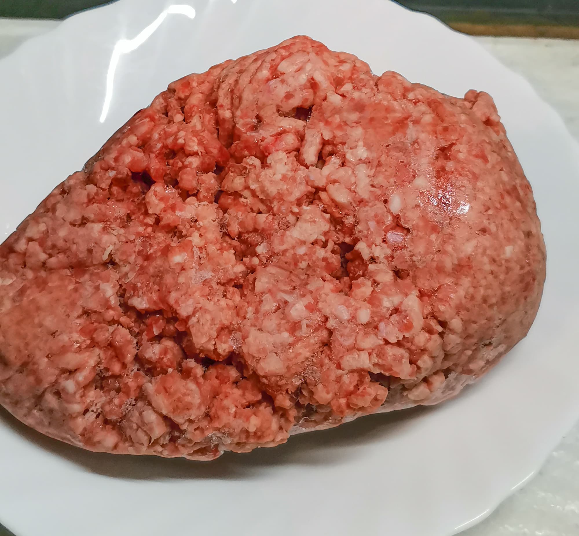 Мы взяли свежий фарш из говядины пополам со свининой, отделили 800 г и положили на 12 часов в морозилку при −18 °C.