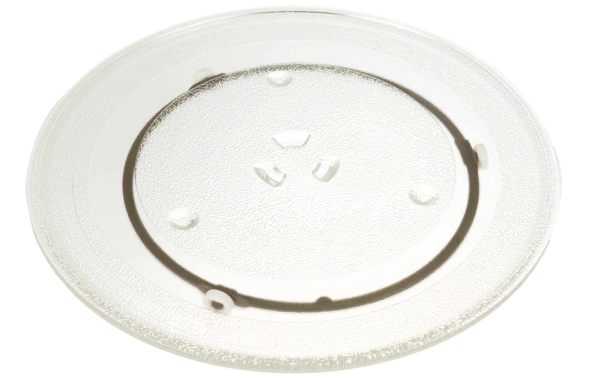 Поддон стеклянный, толстый, диаметром 288 мм. Для вращения он установлен на круглую раму с маленькими колесиками.