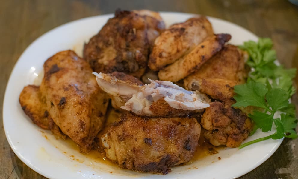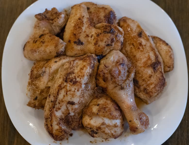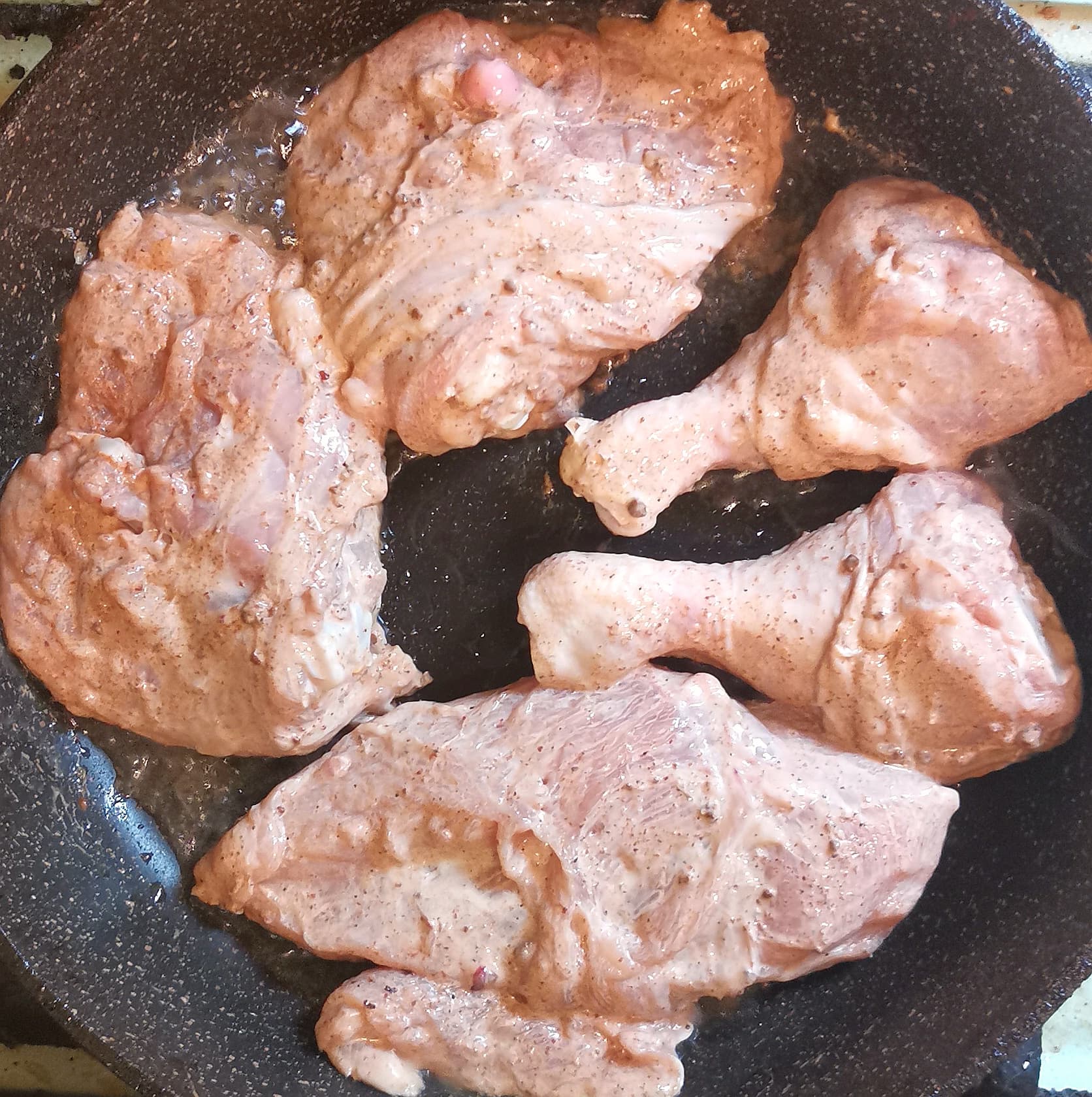 Для курицы по этому рецепту необходимо отдельные части тушки обвалять в специях, посолить и обжарить на сковороде на максимальном огне до образования красивой корочки (4-6 минут). Мясо внутри куска при этом должно оставаться розовым.