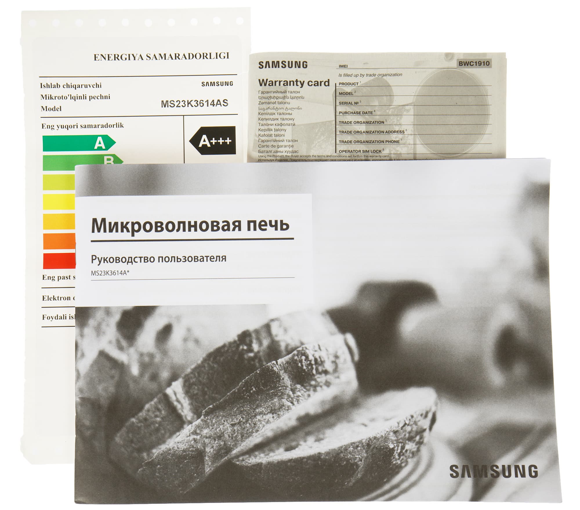 Особенно подробно описывается управление и работа печи в разных режимах, что является несомненно полезной информацией. В таблицах дано руководство по приготовлению самых распространенных замороженных и свежих овощей, свежих и замороженных разнообразных продуктов, а также риса и макаронных изделий. Также в инструкции есть раздел об устранении неисправностей. Инструкция написана понятным языком, и мы бы рекомендовали ознакомиться с ней перед установкой и началом готовки в Samsung MG23K3614AW.