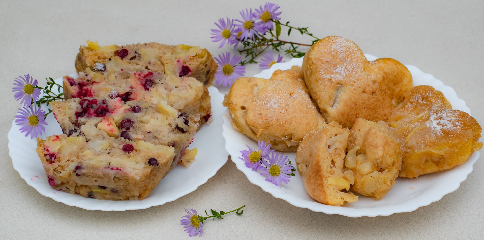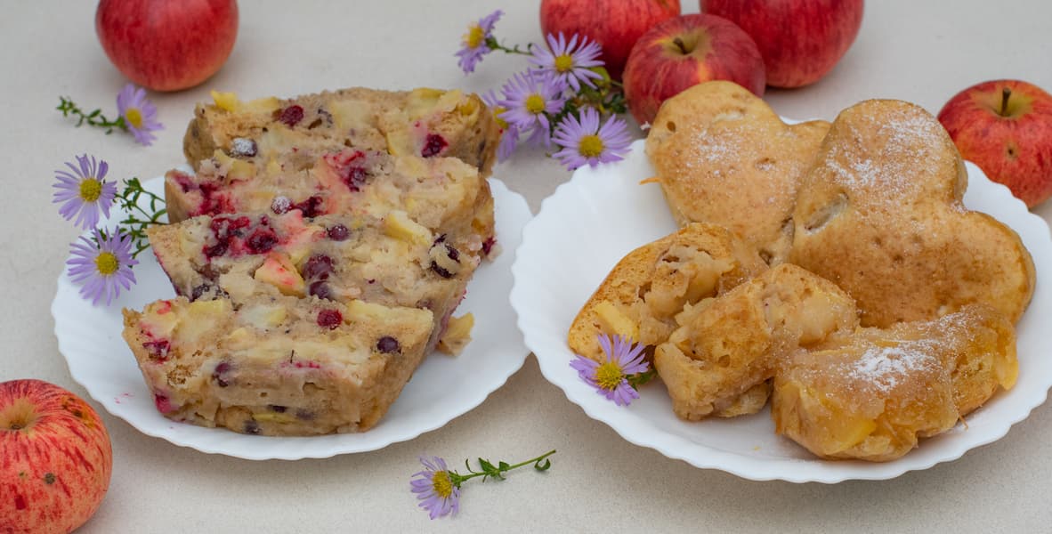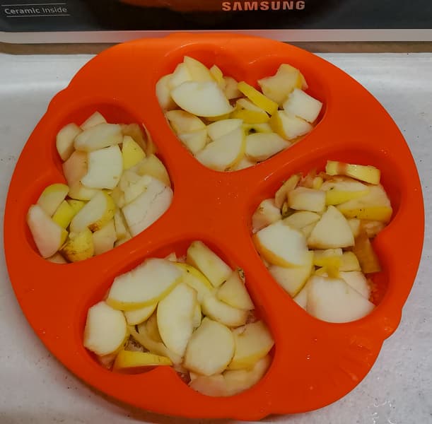 Хоть в Samsung MG23K3614AW нет режима конвекции, мы все-таки попробовали приготовить в ней выпечку. Решили сделать быстрый бисквит с яблоками и клюквой и карамельный бисквит с яблоками.