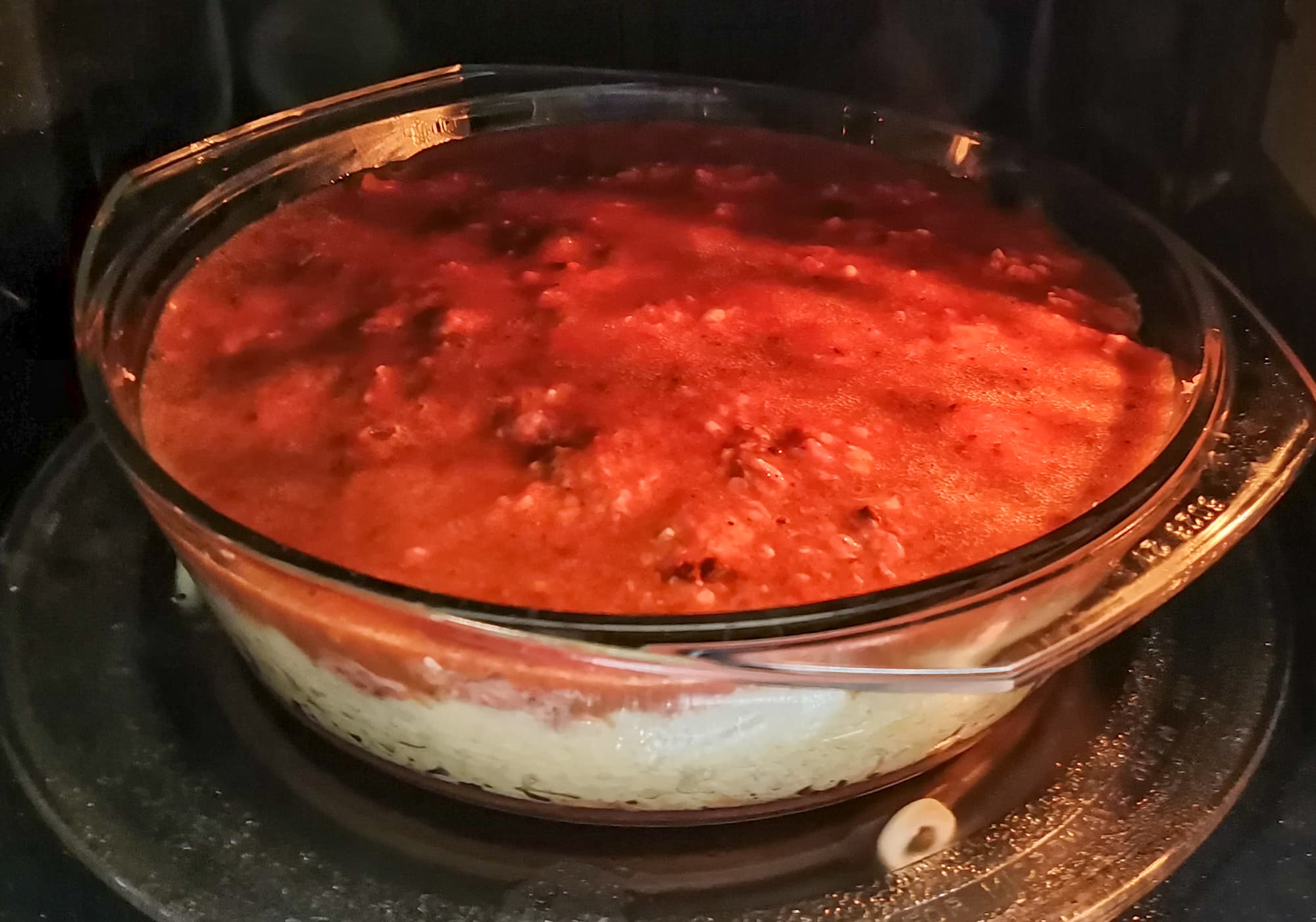 Через 25 минут вынули запеканку. Верх был еще сыроват, поэтому мы включили режим средние микроволны + гриль и доготовили запеканку еще в течение 7 минут. Сверху образовалась красивая корочка, под которой достаточно равномерно приготовился фарш.