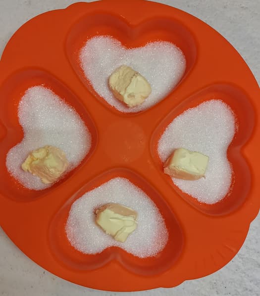 Для этого в форму из силикона насыпали сахар, положили масло, поставили растапливаться на максимальной мощности.