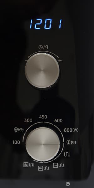 Samsung MG23K3614AW имеет интуитивное управление, которое сосредоточено на двух поворотных регуляторах — верхнем для выставления времени или веса и нижнем для установки мощности и режима работы. Над регуляторами дисплей с индикацией времени, на нем показано или текущее время в режиме часов, или время приготовления с обратным отсчетом. Никаких клавиш «пуск» и прочих выключателей нет: для того, чтобы прибор заработал, нужно выставить время и через пару секунд он включится сам.