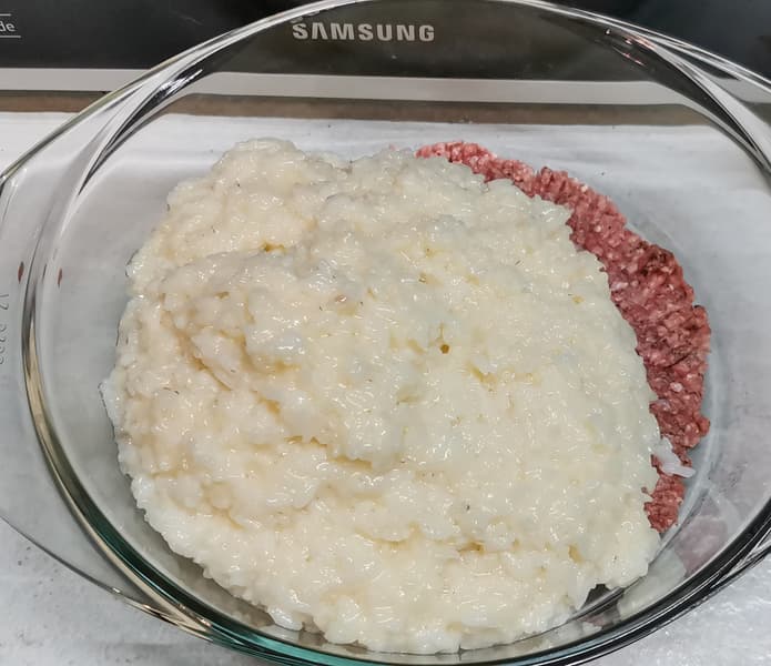 Для запеканки мы использовали наш размороженный фарш и остатки рассыпчатого риса, сваренного накануне. Фарш смешали с яйцом, специями, солью, перемешали и разделили на 2 части.