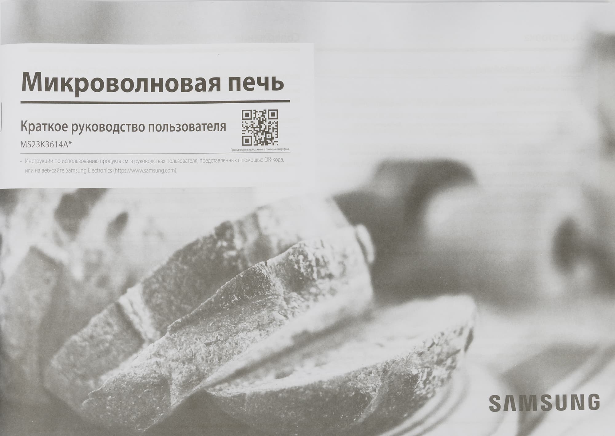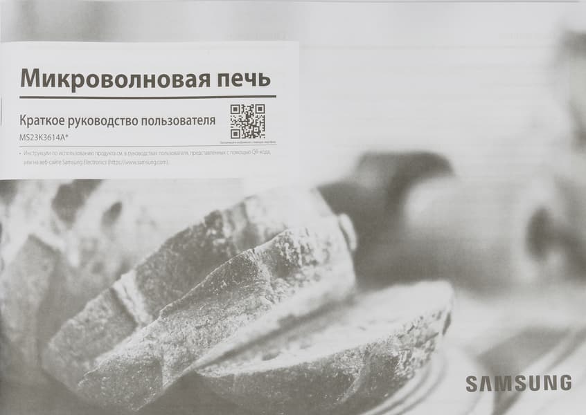 Инструкция вызвала у нас удивление: в бумажном варианте содержится информация по безопасности, установке, обслуживанию и выбору посуды, однако отсутствуют сведения об управлении микроволновкой. Лишь после внимательного изучения мы обнаружили, что производитель предлагает перейти по QR-коду к полному руководству на сайте. Там уже можно подробно узнать о функциях, способах управления и особенностях приготовления пищи — правда, последние представляют собой в основном рекомендации по режимам разогрева разных продуктов.