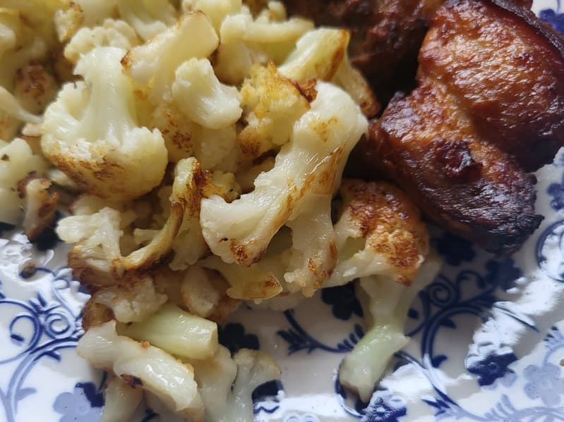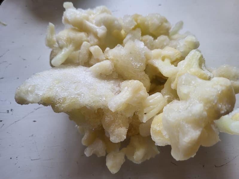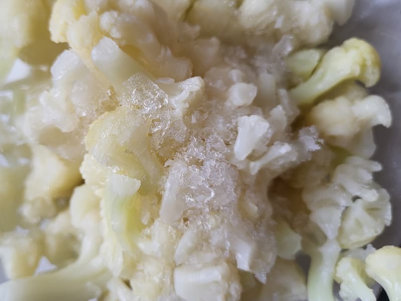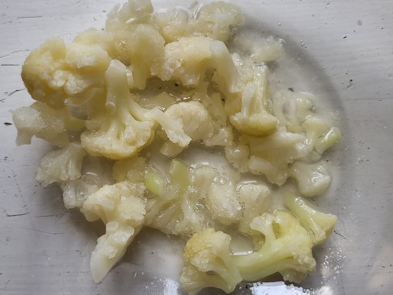 Через 9 минут 35 секунд мы получили не полностью размороженную цветную капусту, сняли более разморозившуюся часть, а остальное снова отправили в микроволновку, выставив вес 200 г.