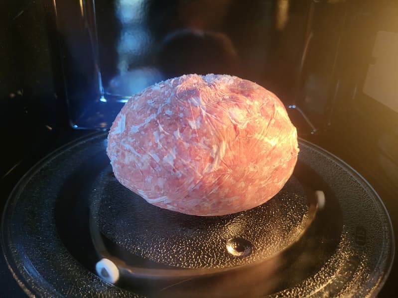 Мы приготовили фарш и убрали его в морозильную камеру на сутки — за это время он превратился в плотный замерзший ком. Затем переложили его в микроволновку, выбрали режим разморозки и указали вес — 800 граммов. Микроволновка выставила время разморозки 19 минут 13 секунд. Через 9 минут 33 секунды прозвучал звуковой сигнал, предлагающий перевернуть продукт; фарш мы перевернули, но никаких существенных изменений в его состоянии не заметили.