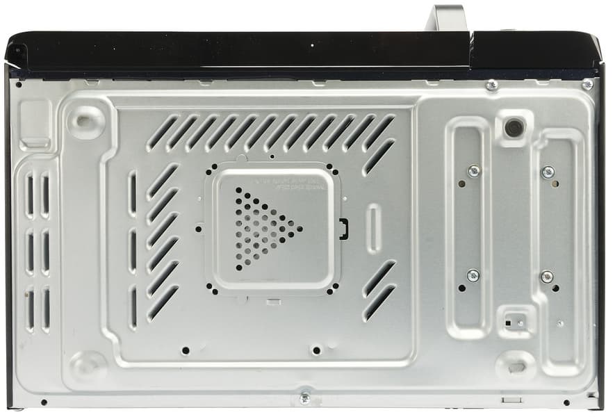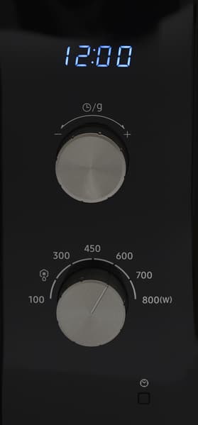 Прибор оформлен в классическом для современных микроволновок стиле: черный глянцевый фасад, почти идеально гладкий, с четкими линиями и минималистичным дизайном. На корпусе расположены два поворотных переключателя стального оттенка, которые не нарушают общего лаконичного и элегантного вида устройства.