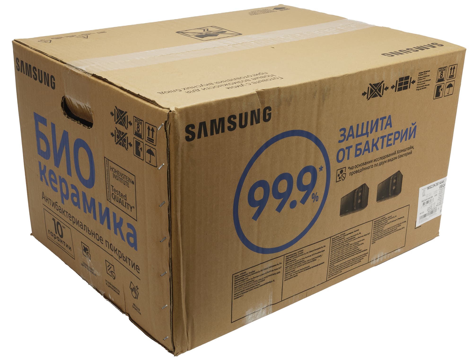 Микроволновая печь была доставлена в большой коробке из гофрокартона. На передней стороне упаковки напечатаны небольшие фотографии устройства. На одной боковой стороне также есть фото микроволновки и пиктограммы с информацией о характеристиках прибора и правилах транспортировки, а на другой — указание на биокерамическое покрытие внутренней камеры.