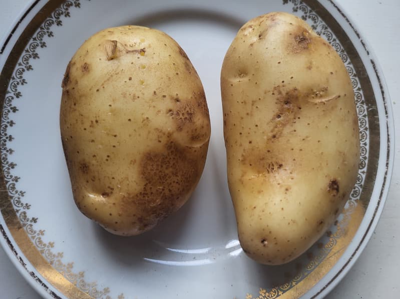 Второй известный нам способ приготовления картошки в мундире — это отправить ее в микроволновку. Мы взяли две довольно крупные картофелины, проткнули картофельную кожуру вилкой в нескольких местах, чтобы картошка не взорвалась, выставили максимальный режим (800 Вт) и поместили в камеру на 5 минут.