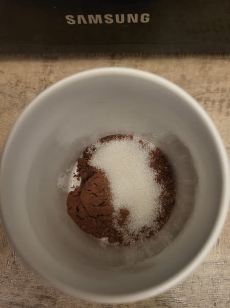 С какао в микроволновке всё оказывается намного проще, чем с какао на плите. Взять две чайные ложки какао-порошка, перемешать с сахаром, залить половиной молока и отправить в микроволновку на минуту.