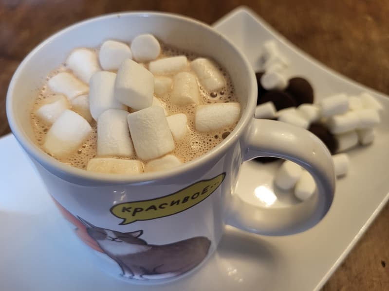 Перемешать, посыпать зефирками — и прекрасный напиток для холодных зимних (ну, или летних, как в нашем случае) вечеров готов. Никакой возни с кастрюльками, газом, плитой и тому подобным. И мыть надо только одну чашку, а не чашку и ковшик из-под какао.