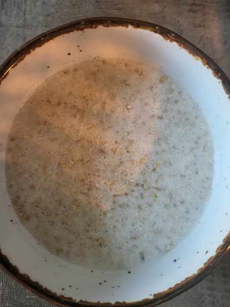 За 1 минуту каша, конечно, не успела приготовиться, поэтому мы отправили ее в микроволновку еще на полторы минуты, а потом еще на минуту, чтобы получить кашу такой консистенции, как нам хотелось.