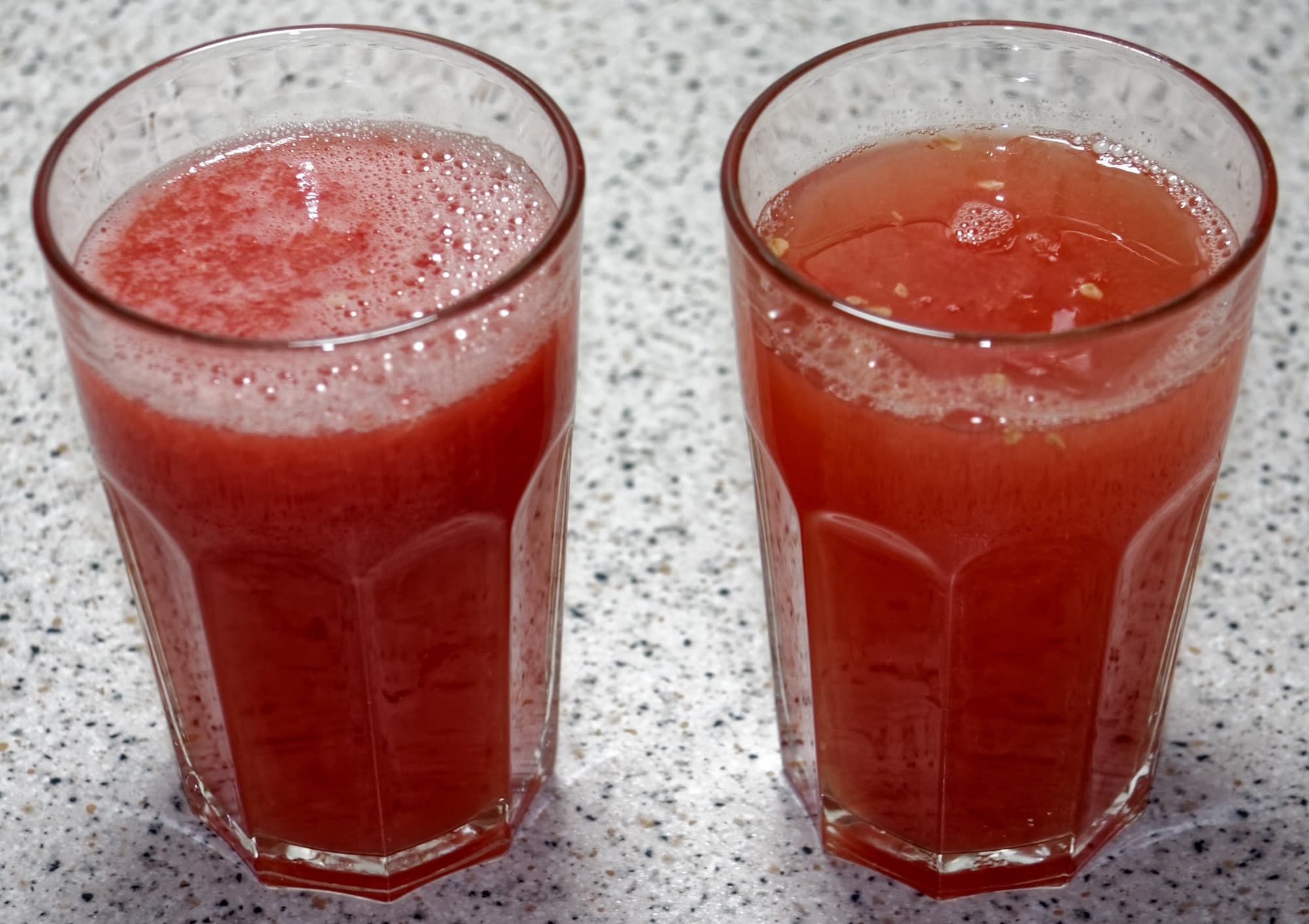 На всех фото: слева — сок из шнековой соковыжималки, справа — из пресса.