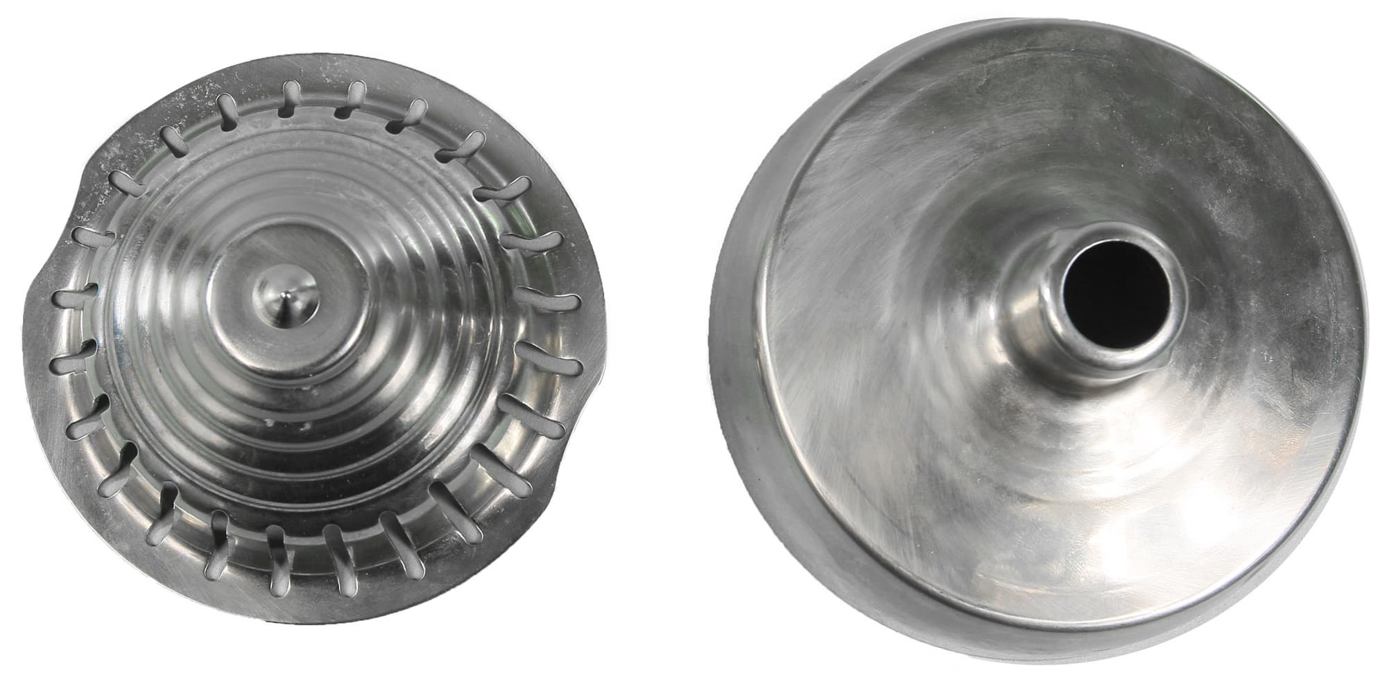 Чаша для отжима состоит из трех основных элементов, сделанных из нержавеющей стали: верхний конус закреплен на подвижной части. Нижняя (съемная) часть состоит из воронки и решетки-фильтра, предотвращающей попадание косточек в отжатый сок. Съемные элементы имеют специальные выступы и вырезы, позволяющие зафиксировать их в рабочем положении. Фиксация осуществляется поворотом элементов относительно друг друга (или относительно корпуса прибора).