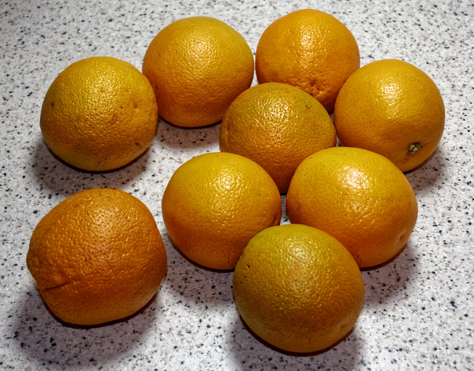 Апельсины среднего размера были подготовлены — нарезаны пополам для отжима сока с помощью пресса и очищены от кожуры для отжима сока в шнековой соковыжималке.