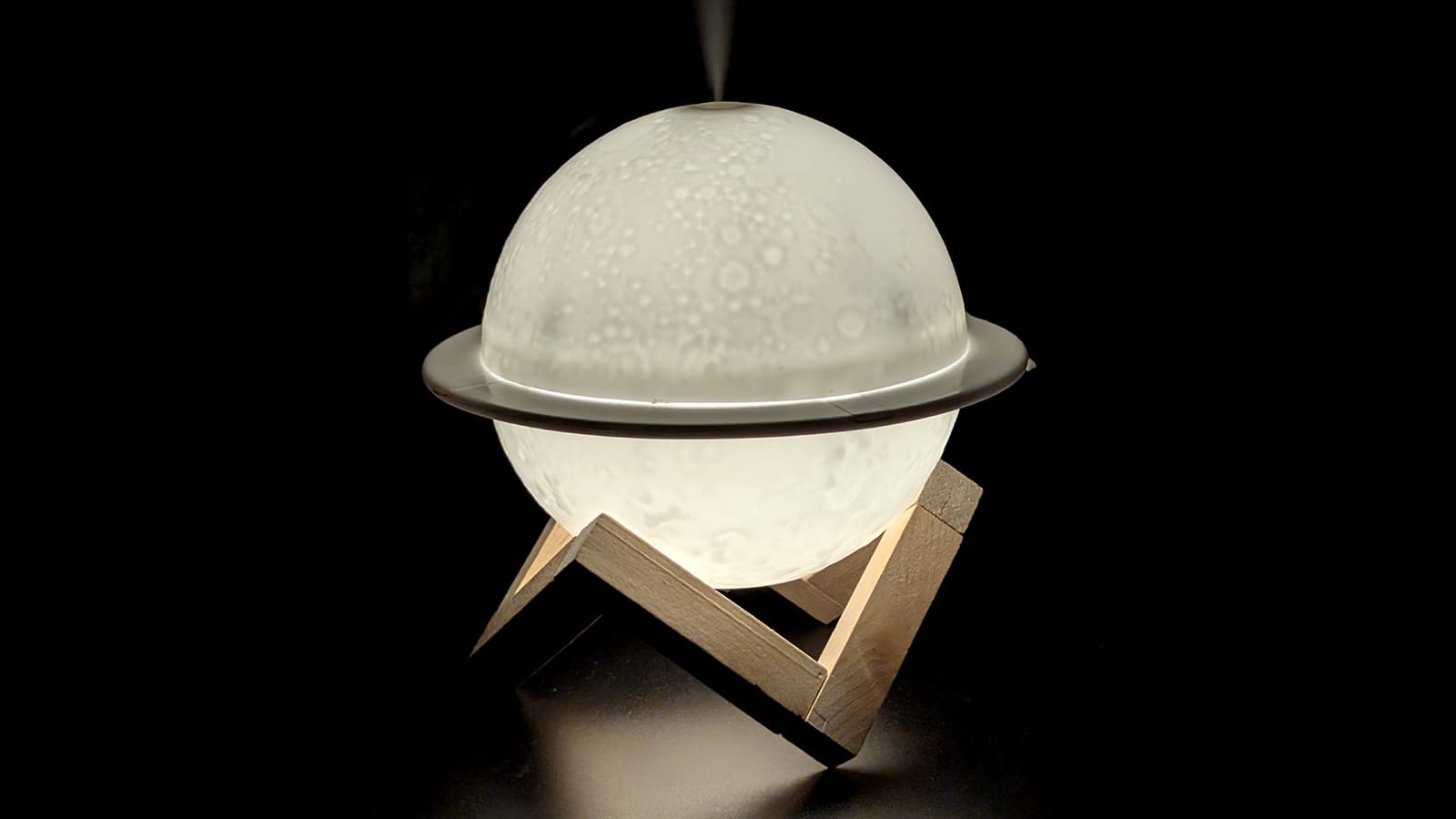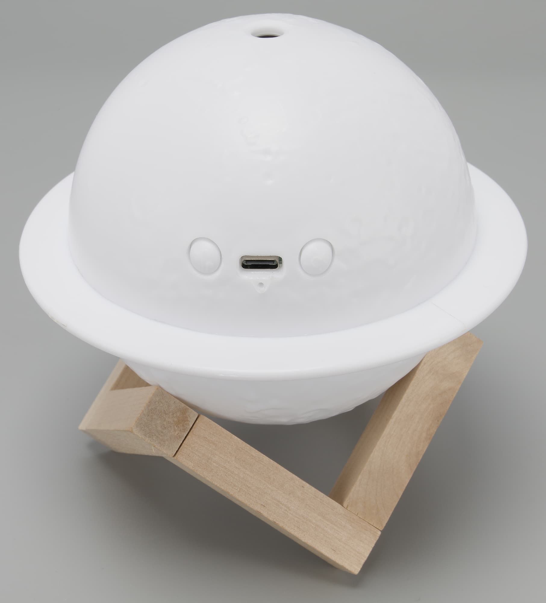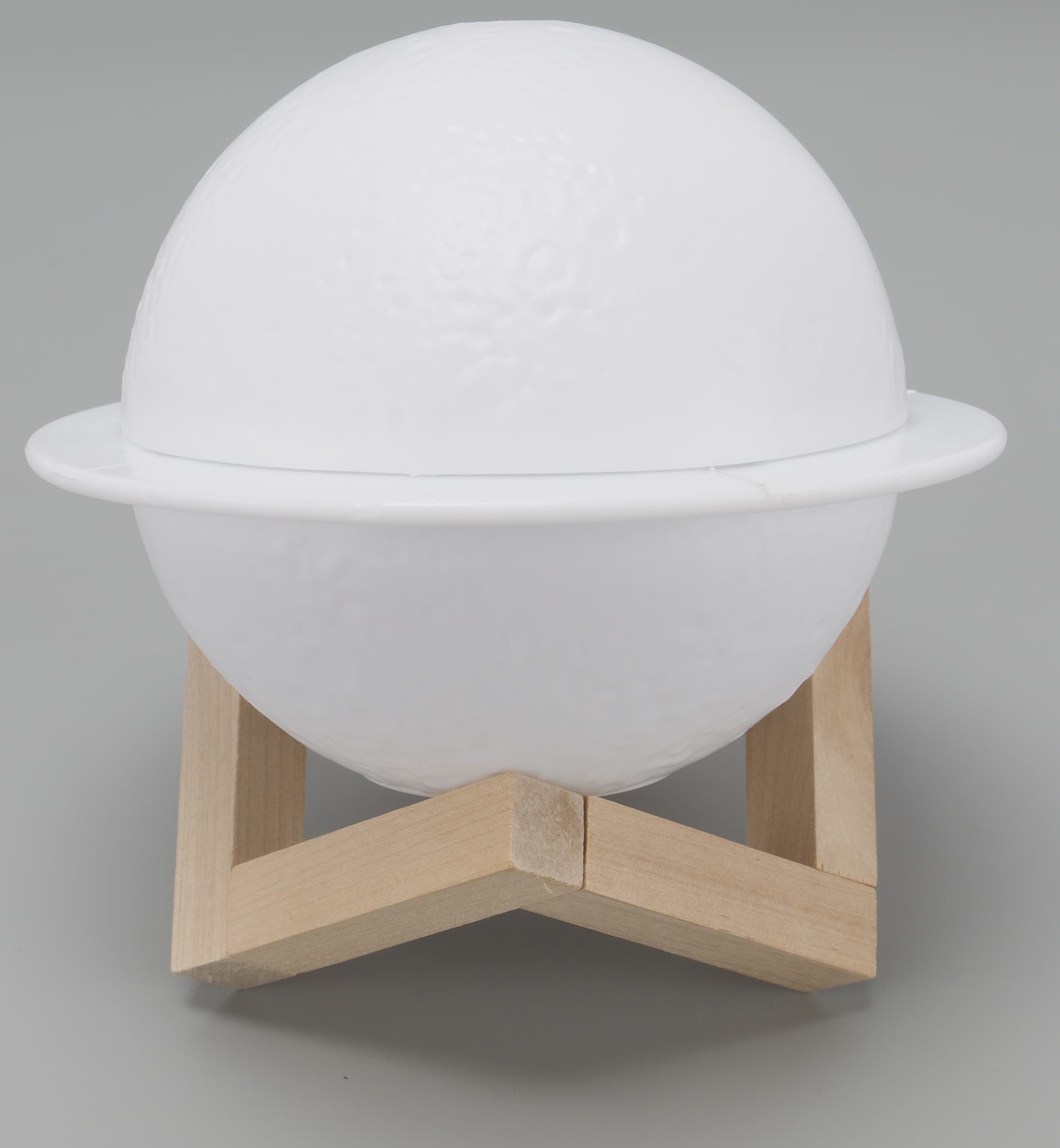 Корпус увлажнителя (условно назовем исследуемый прибор именно так) сделан из полупрозрачного белого пластика и имеет форму сферы. «Космический» вид «сатурну» придают декоративный поясок, напоминающий о кольцах этой планеты, и фактура поверхности, похожая на лунные кратеры.