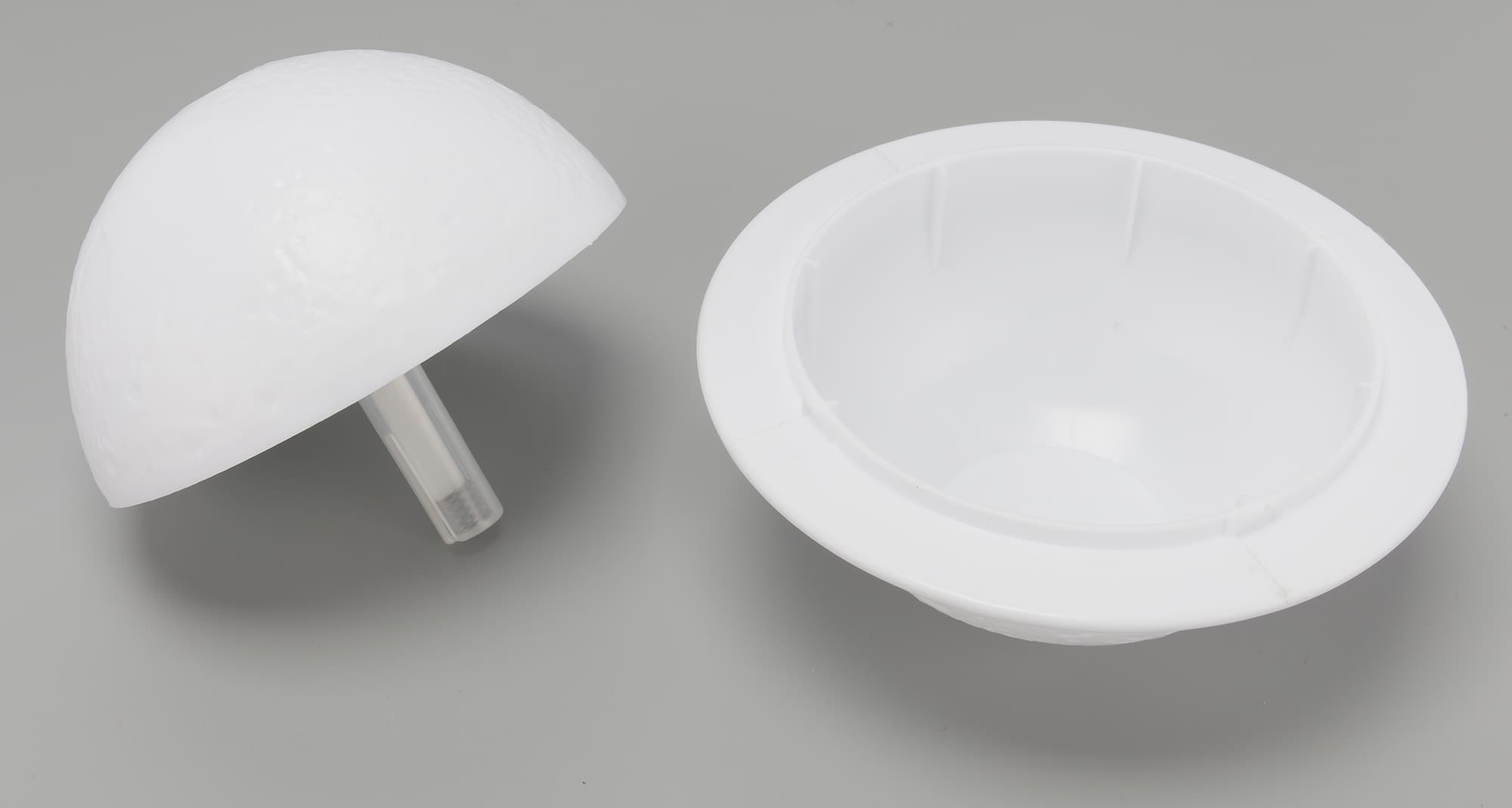 На дне нижней полусферы — небольшая площадка: устройство может не только размещаться на прилагаемой подставке, но и вполне устойчиво стоять на любой ровной и твердой поверхности. Емкость резервуара невелика: чуть меньше 300 мл.