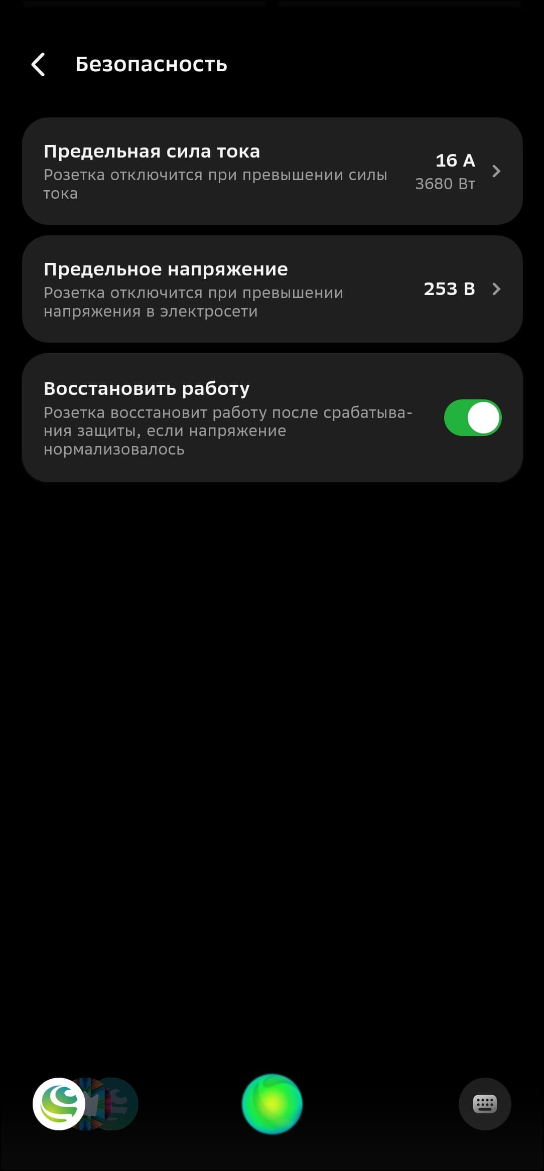 Самое же интересное, находится на вкладке «Безопасность». Здесь можно настроить отключение розетки при достижении предельной силы тока или напряжения — полезная функция, которая поможет обеспечить безопасность подключенных приборов и корректную работу удаленного управления в случае проблем с энергоснабжением. Правда, сами разработчики признают, что для защиты от резких скачков напряжения всё же надо использовать специально предназначенные для этого решения — скорости срабатывания розетки может не хватить.