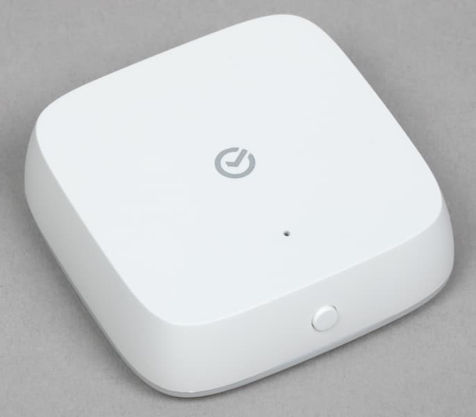 Для работы датчиков нам понадобится Zigbee-хаб. Это компактная белая коробка размером 56×56×54 мм вместе со штекером, которая подключается к розетке. Много места не займет, слишком бросаться в глаза не будет — вот и замечательно. На передней панели размещен светодиодный индикатор состояния.
