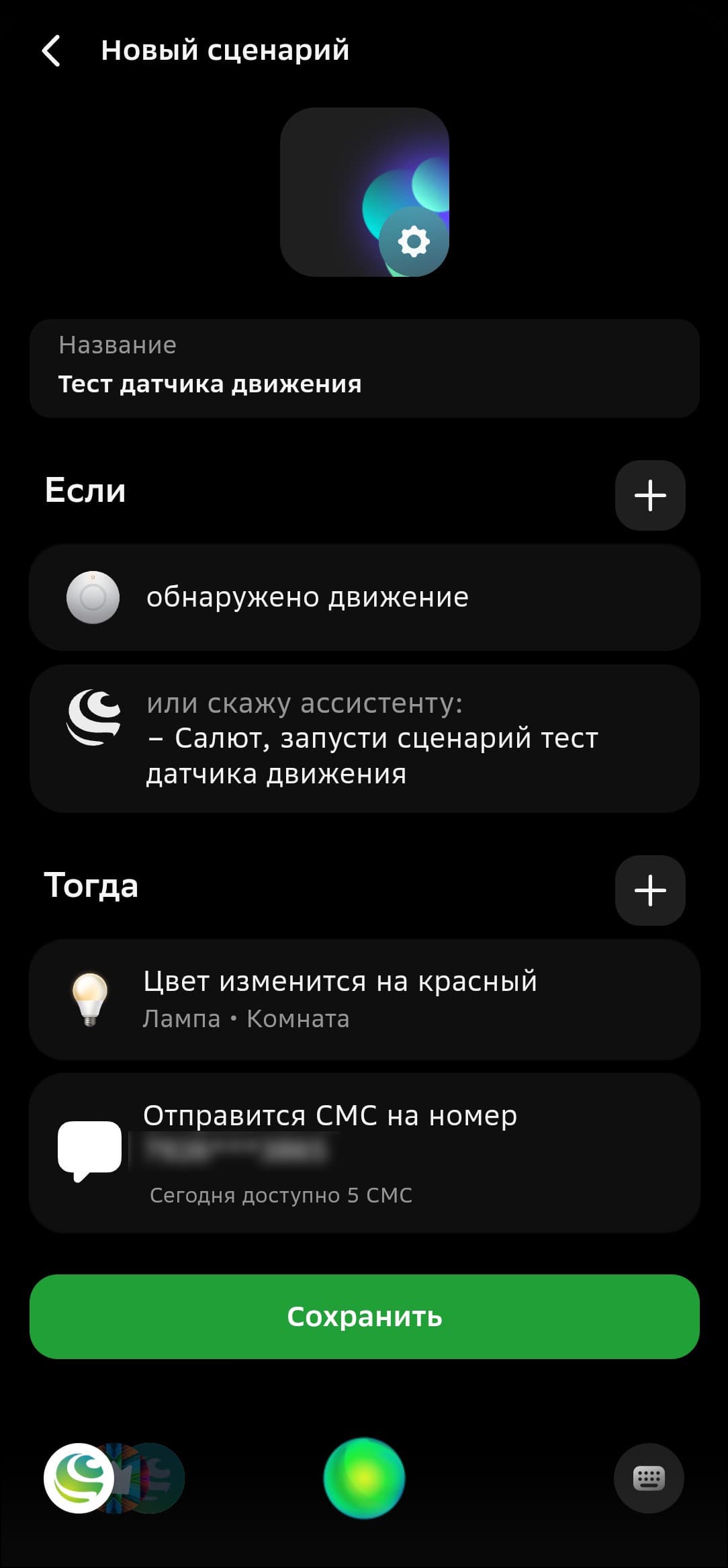 Лампа будет включаться, но это еще не всё. Зачастую пользователю важно знать, что движение обнаружено. Для этого можно использовать пуш-уведомления из приложения. Но они могут не сработать, если нет доступа в интернет. Потому система способна отправлять SMS о срабатывании сценария, при оформлении подписки доступно 6 бесплатных сообщений ежедневно, для срочных оповещений этого вполне достаточно.
