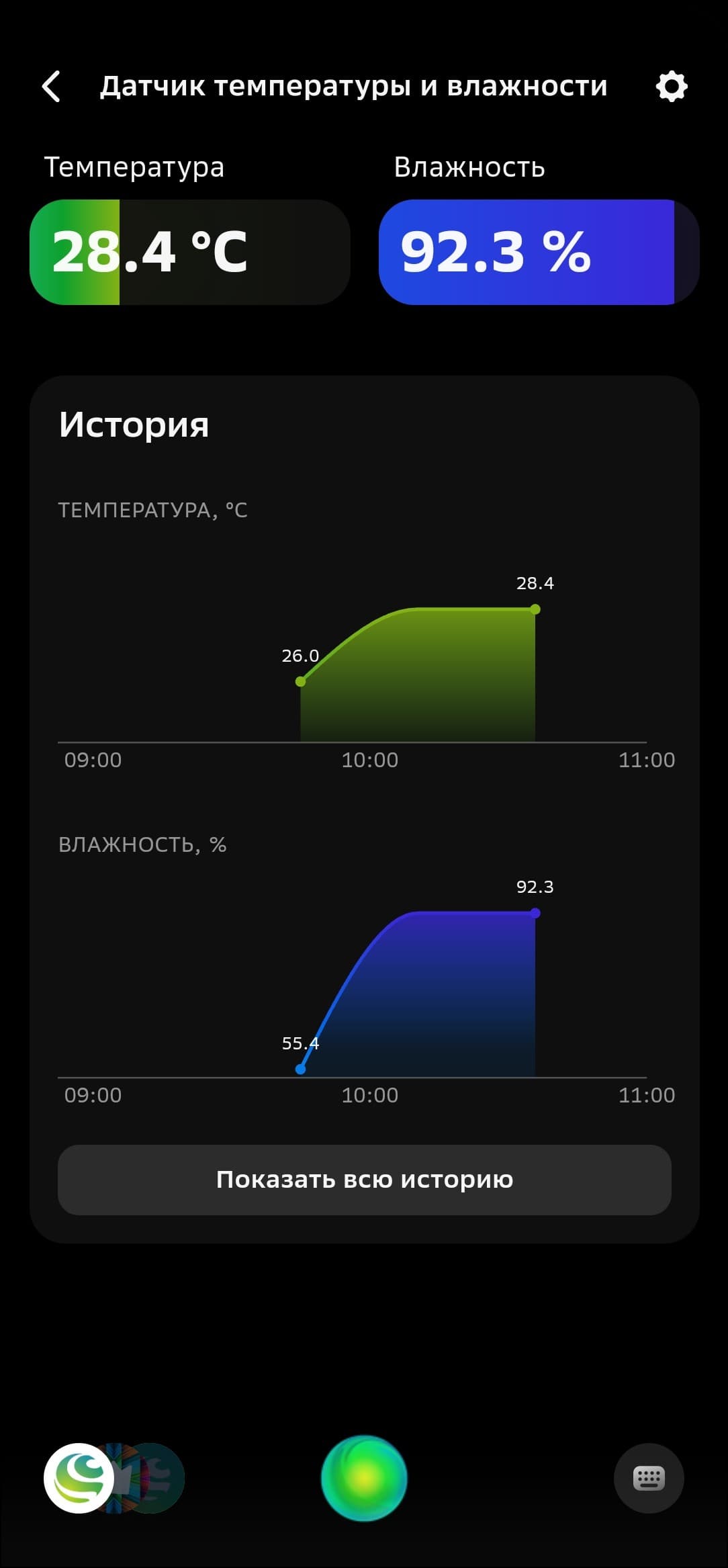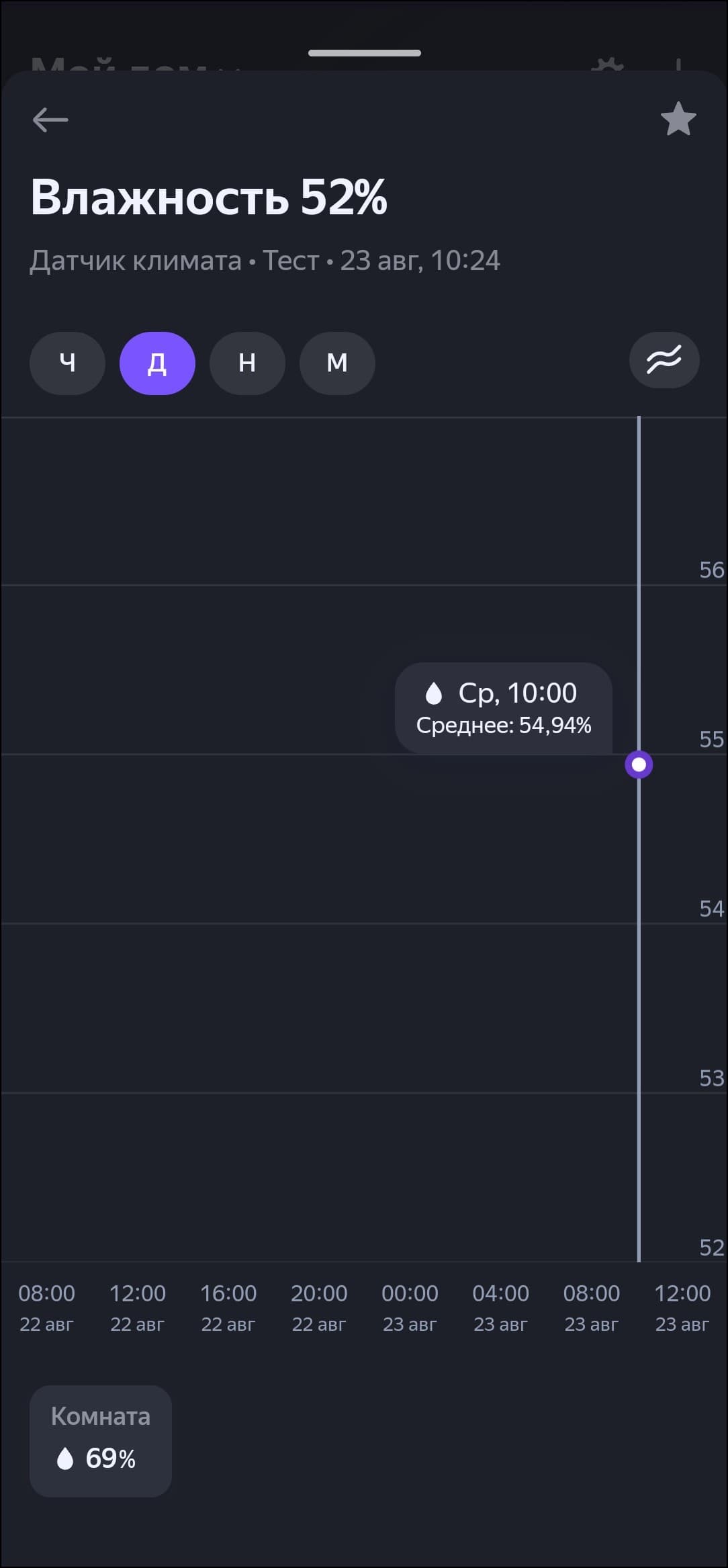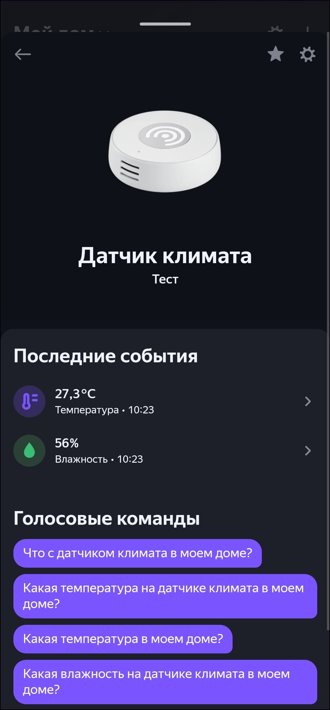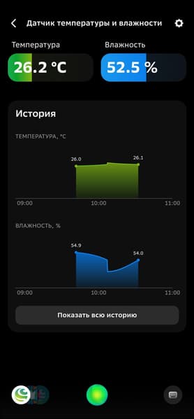 В приложении доступны текущие температура и влажность, а также динамика их изменения в виде графиков. Ну и, конечно, про «погоду в доме» можно спросить у голосового ассистента. Разработчики анонсировали повышенную скорость реакции датчика на изменение условий — мы попробовали нагревать и охлаждать его, данные меняются буквально на глазах, для бытового использования скорости обновления точно хватит.