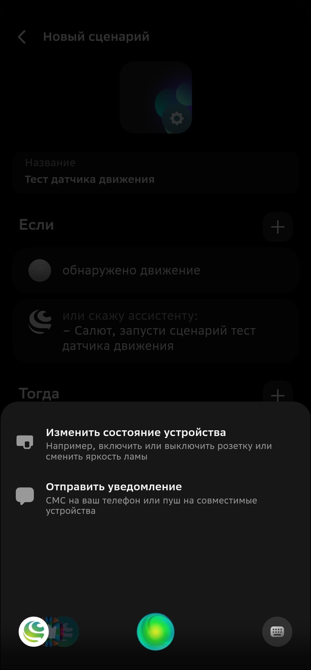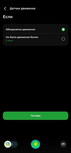 Выбираем датчик в качестве триггера для срабатывания сценария, есть два варианта — обнаружение движения или его отсутствие в течение 5 минут. В качестве реагирующего устройства выберем уже знакомую нам смарт-лампу.
