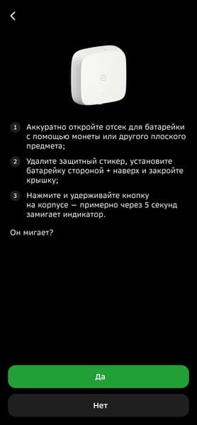Под батарейкой размещен элемент, выключающий устройство на время транспортировки — перед началом эксплуатации его нужно удалить. Если забудете — приложение напомнит. Заходим на страницу добавления устройств, находим нужный датчик — запускаем подключение.