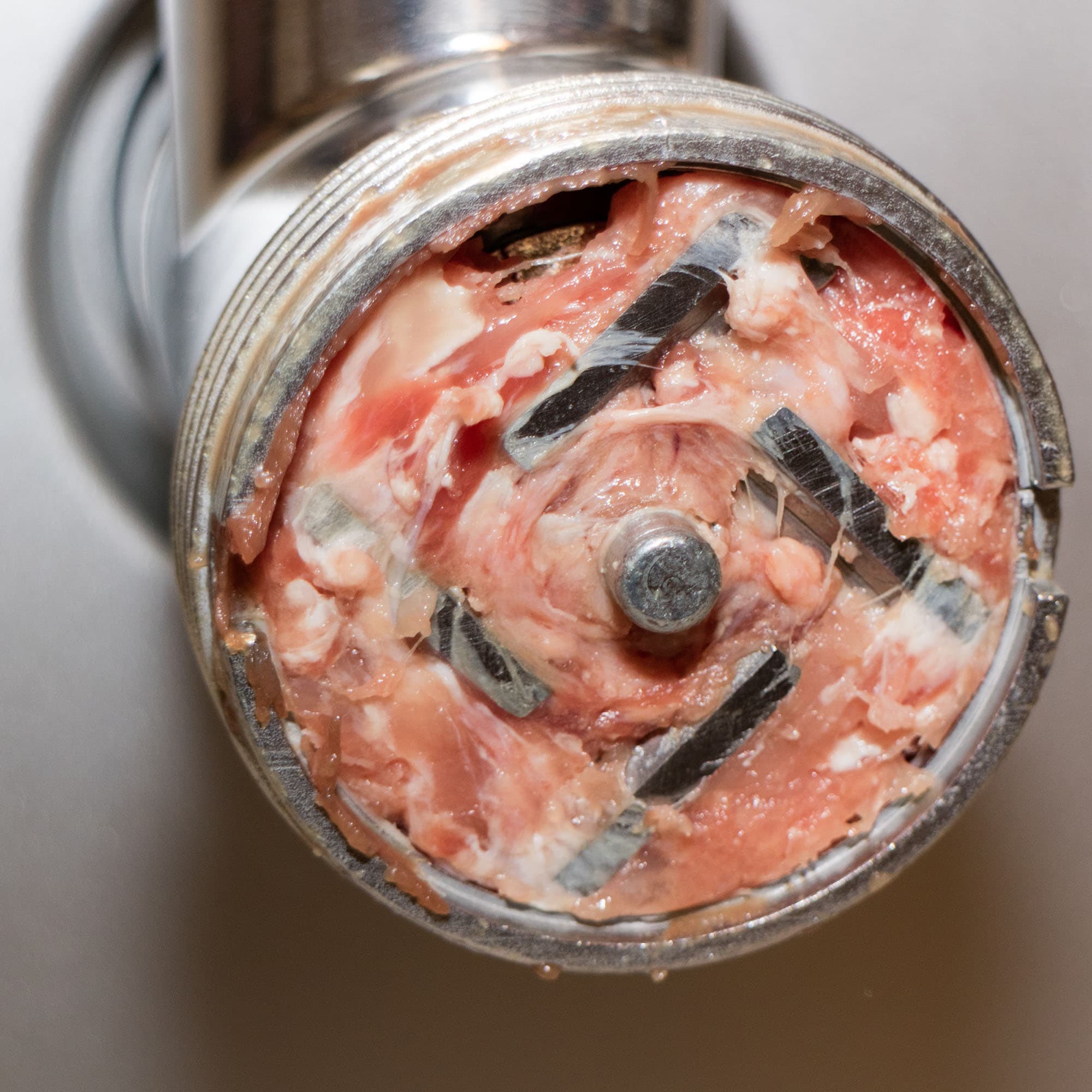 Производительность — это вес мяса, который мясорубка перемалывает за одну минуту. Согласно методике, в данном стандартом тесте был использован постный свиной окорок, не подвергавшийся заморозке, очищенный от пленок и жира. Мясо было нарезано на куски, способные легко пройти в горловину мясорубки. Обычно для данного теста мы используем решетку со средним диаметром отверстий. Создатели данной мясорубки освободили нас от выбора решетки для проведения стандартного испытания — в комплект входит всего одна решетка.